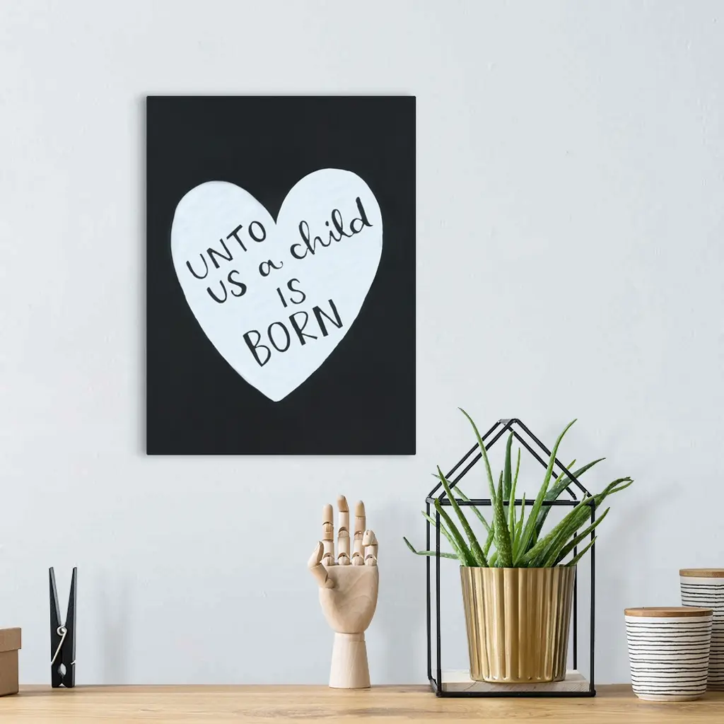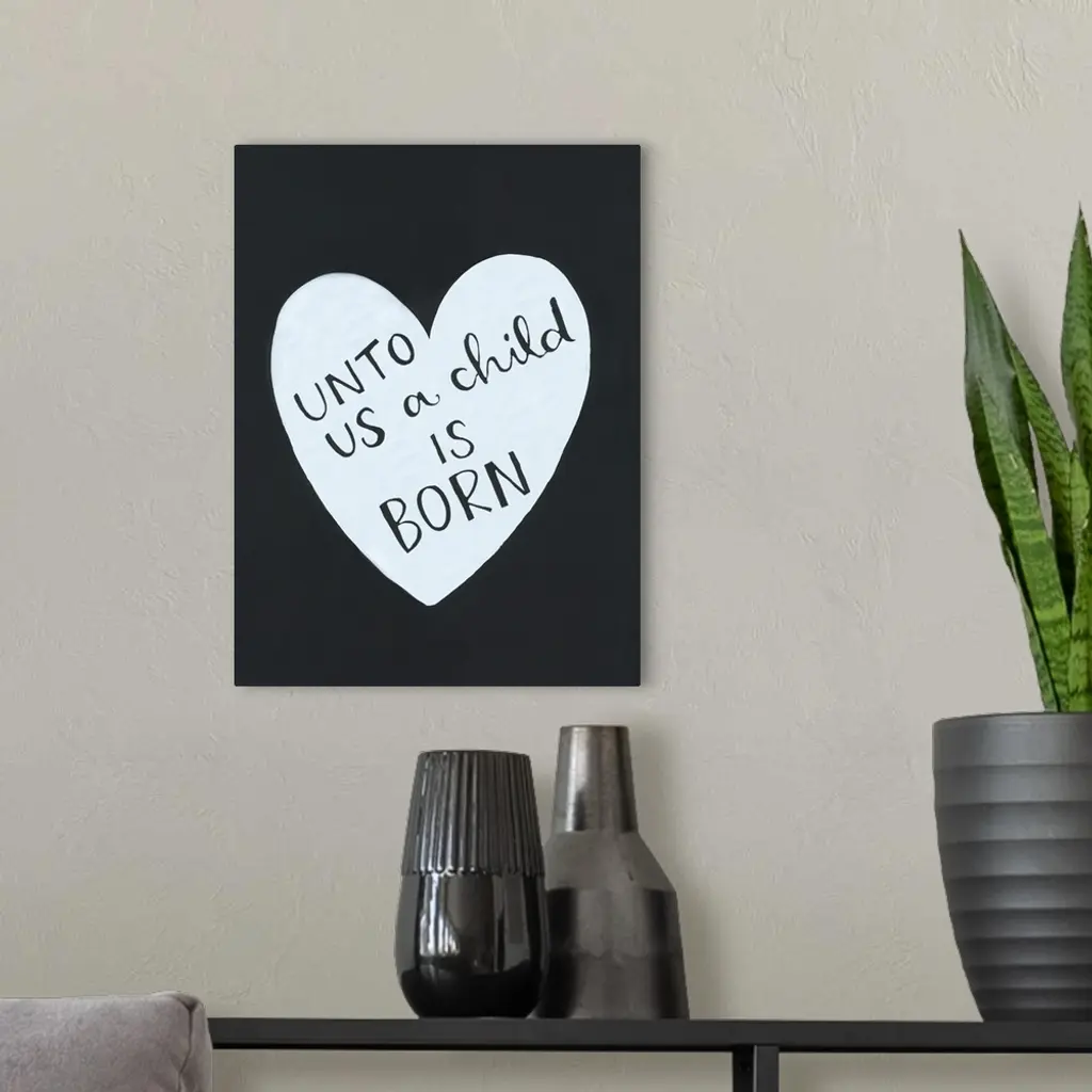 The text "Unto us a child is born" handwritten inside a heart shape on a dark background.