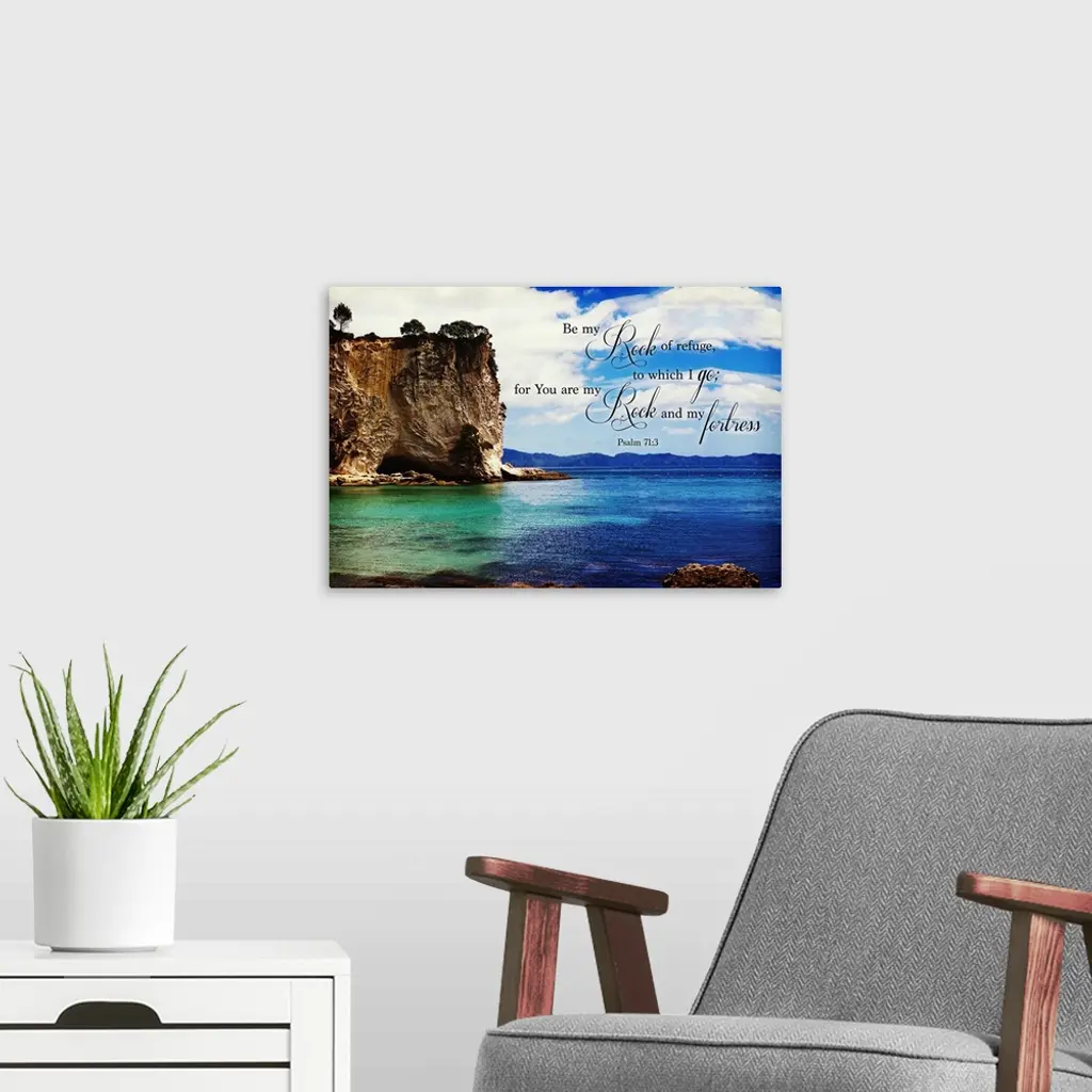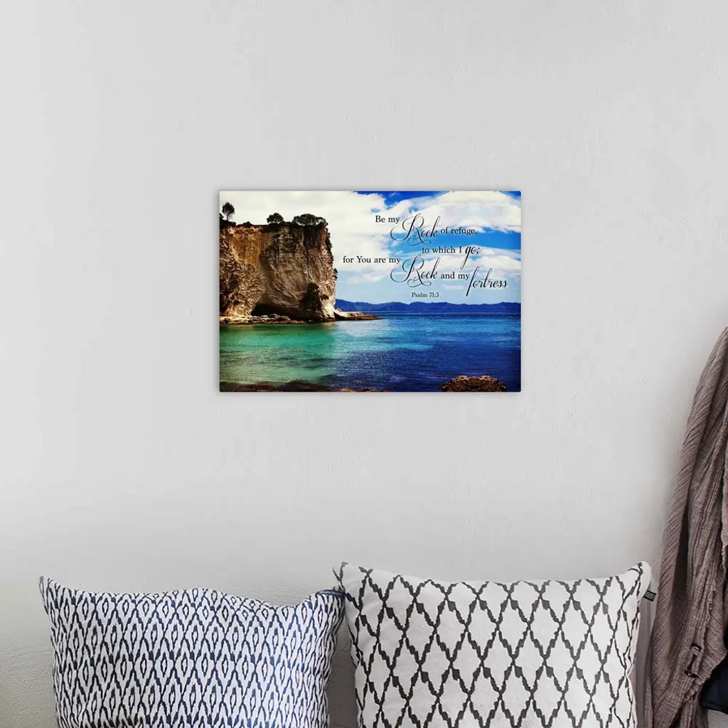 Image Of A Cliff On The Coast With Blue And Turquoise Water And Scripture From Psalm 71:3