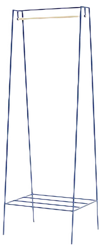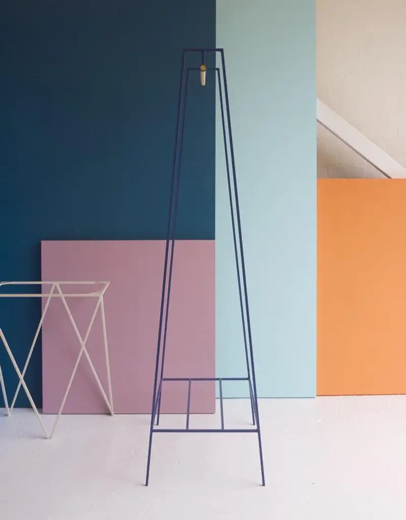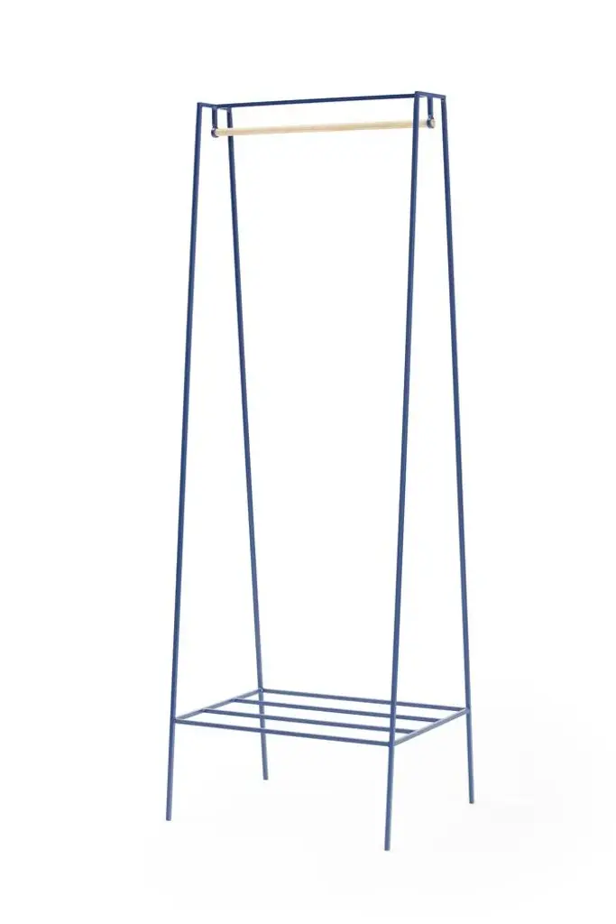 The steel A clothes rail is one of &New's signature pieces. A stunning addition to any bedroom or hallway, the minimal design looks delicate but is surprisingly robust. The A clothes rail is made out of powder coated steel and is fully welded. This one is powder coated in blueberry. Includes detachable solid pine pole for hangers and shelf for shoes and bags. Perfect height for dresses or coats. All &New products are manufactured in Britain in small batches. They have plenty of character as every weld is different. The result is a collection of furniture that celebrates those little imperfections that make objects beautiful. Labeled by Maker,Labeled by Maker