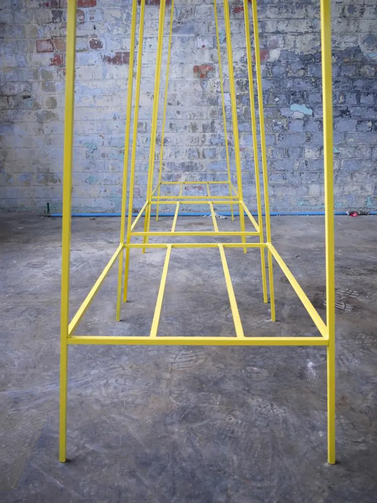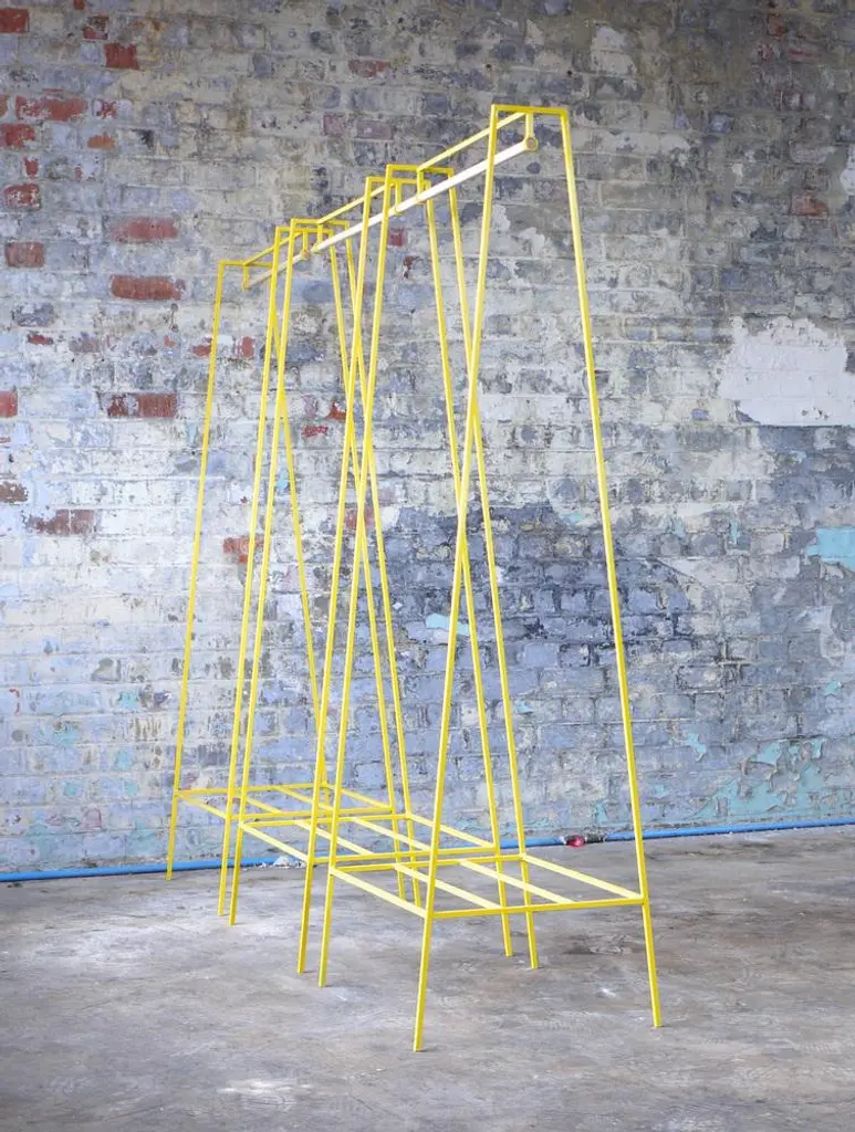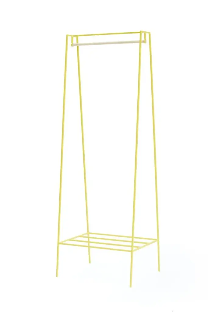 The steel A clothes rail is one of &New's signature pieces. A stunning addition to any bedroom or hallway, the minimal design looks delicate but is surprisingly robust. The A clothes rail is made out of powder coated steel and is fully welded. This one is powder coated in yellow. Includes detachable solid pine pole for hangers and shelf for shoes and bags. Perfect height for dresses or coats. All &New products are manufactured in Britain in small batches. They have plenty of character as every weld is different. The result is a collection of furniture that celebrates those little imperfections that make objects beautiful. Labeled by Maker,Labeled by Maker