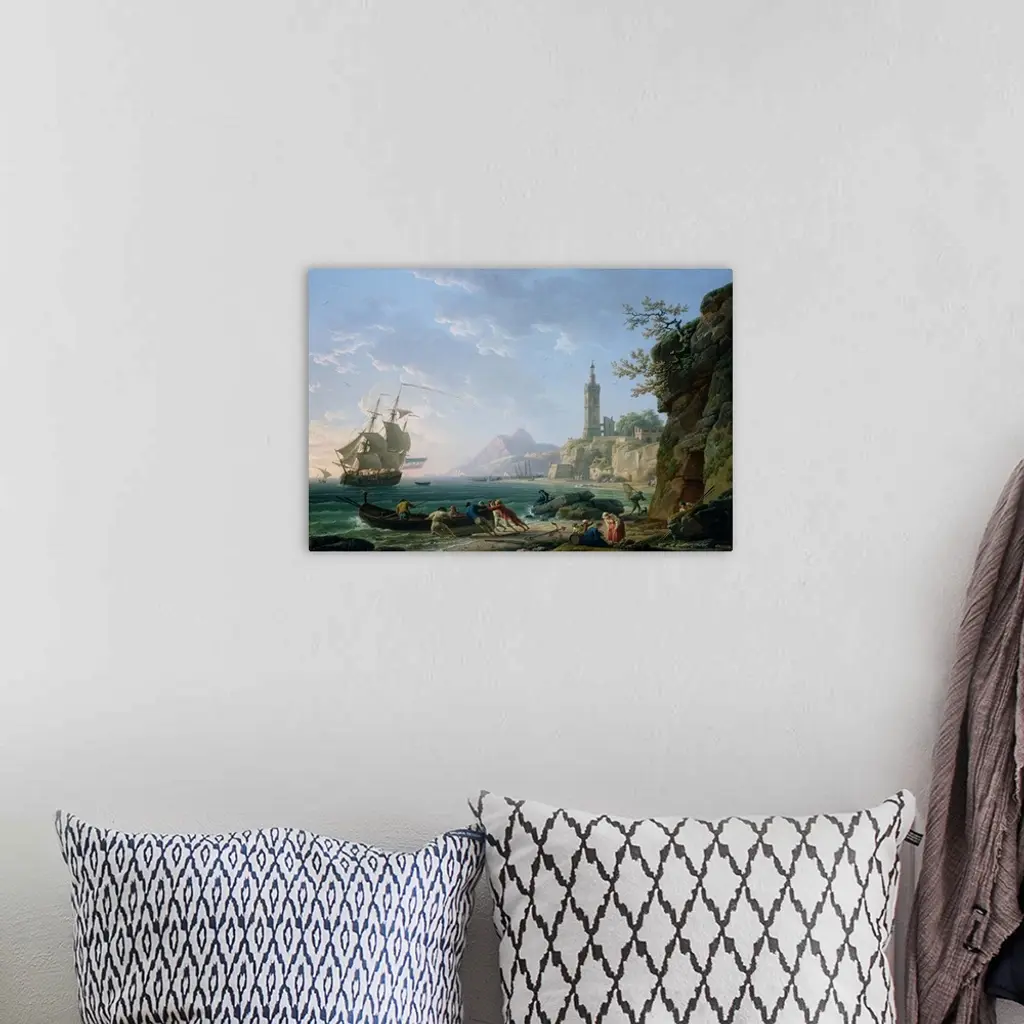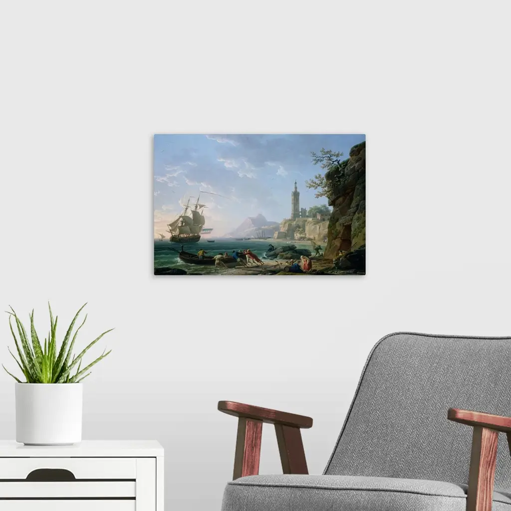 A Coastal Mediterranean Landscape with a Dutch Merchantman in a Bay, 1769 (oil on canvas) by Vernet, Claude Joseph (1714-89) Fitzwilliam Museum, University of Cambridge, UK; French