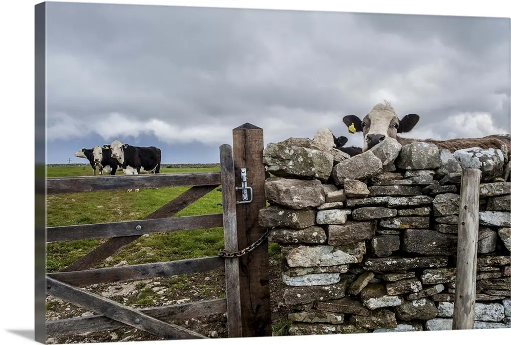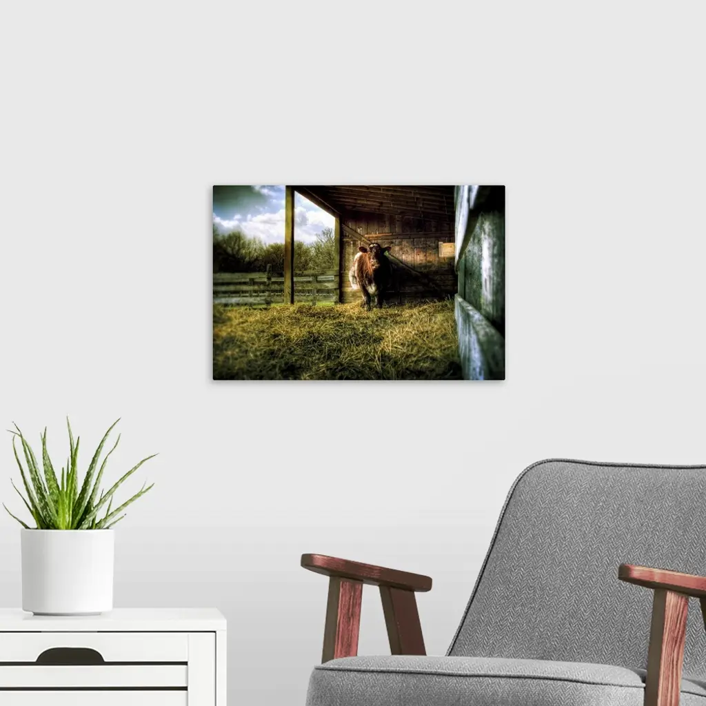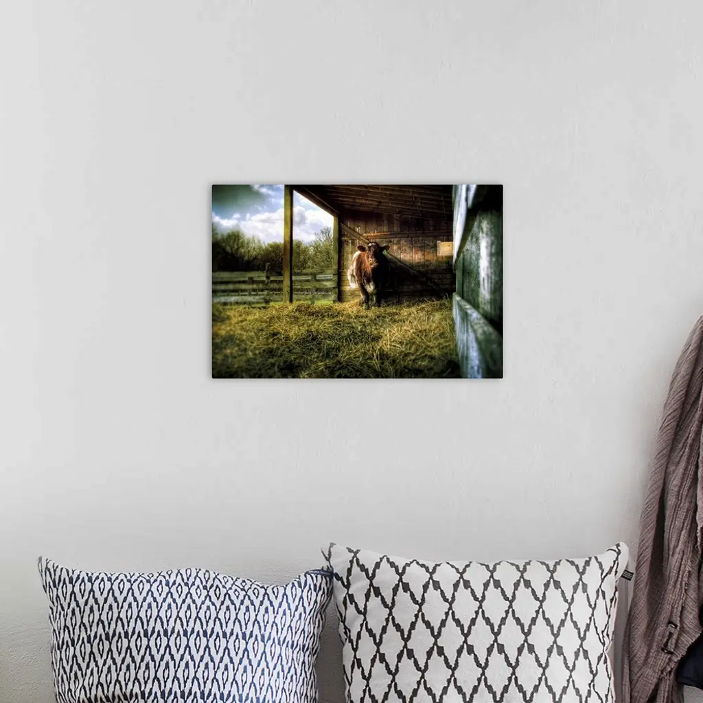 A cow in a cow shed with hay wall art for home and office decor. Discover canvas art prints, photos, mural, big canvas art and framed wall art in GreatBigCanvas.com's varied collections.