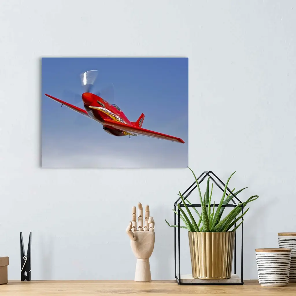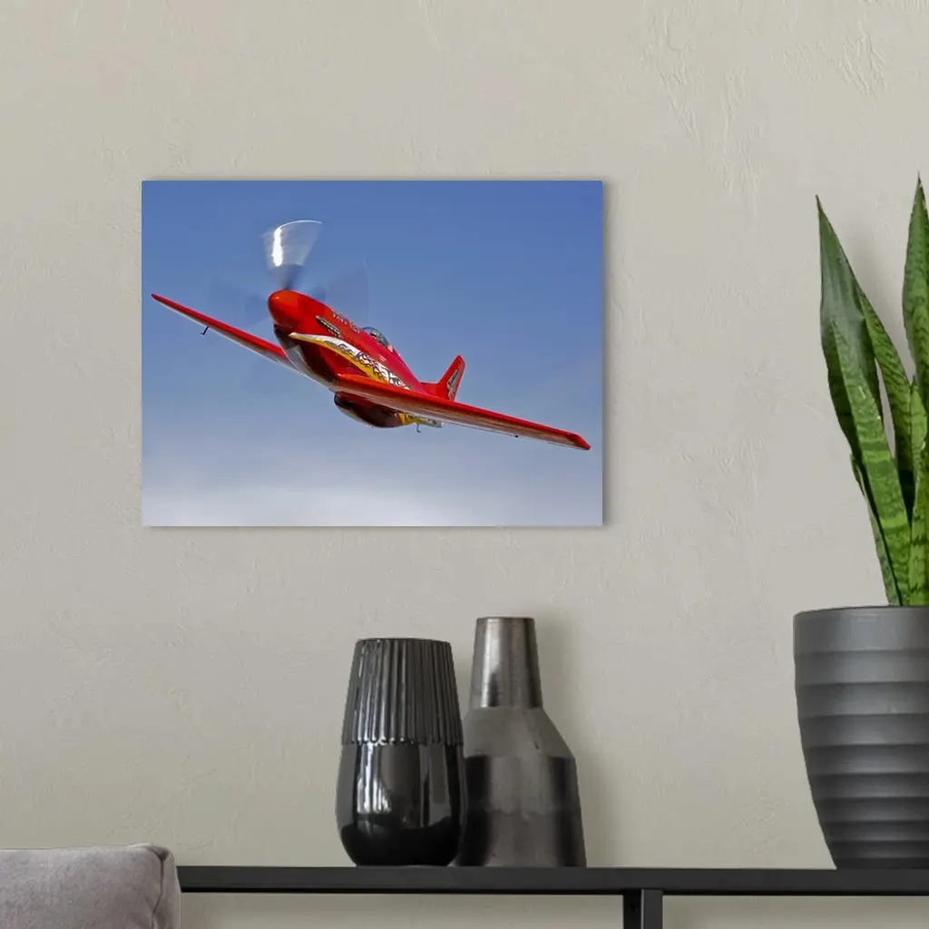 A Dago Red P-51G Mustang modified for competitive air racing, in flight over Hollister, California.