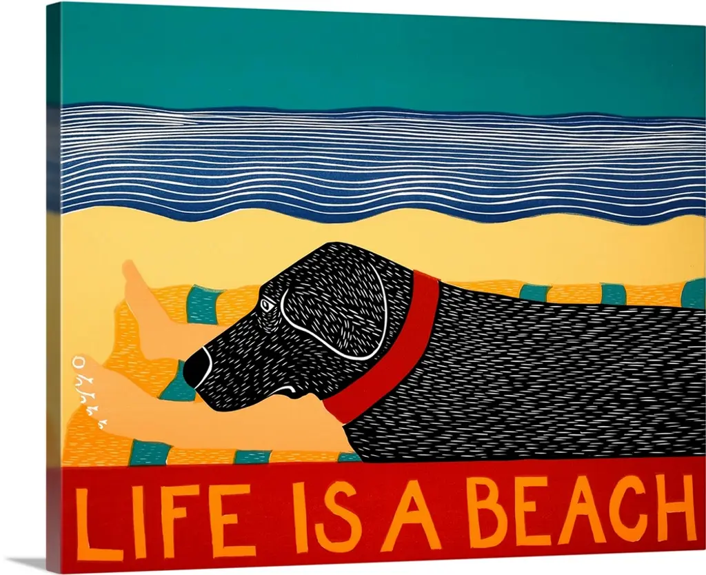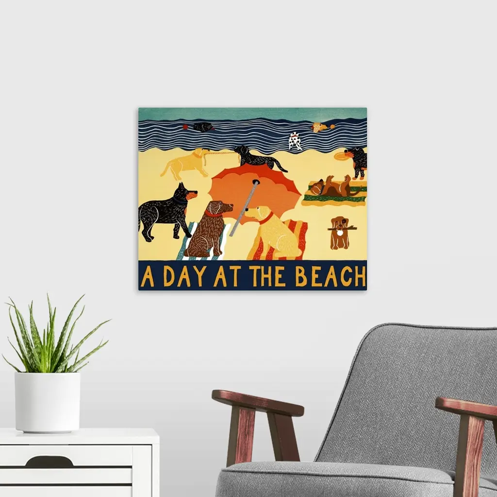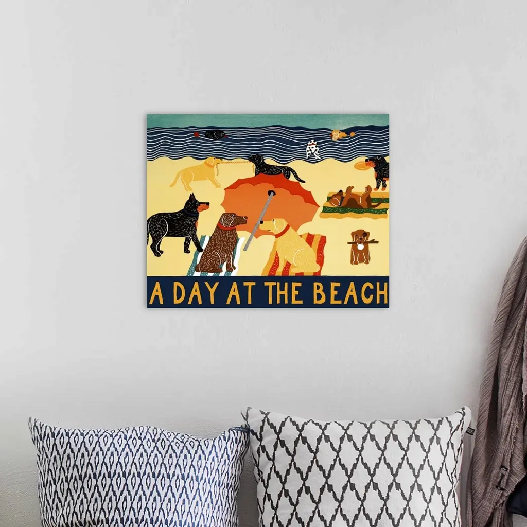 Illustration of different breeds of dogs on the beach with the phrase "A Day At The Beach" written on the bottom in yellow.