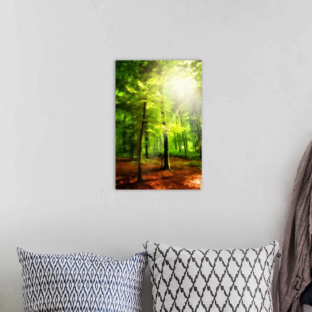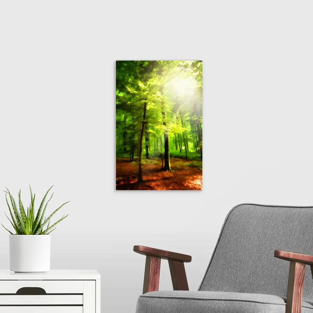 A vibrant colorful photograph of a forest with sunlight shining through the canopy.