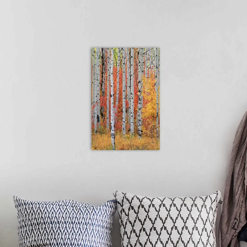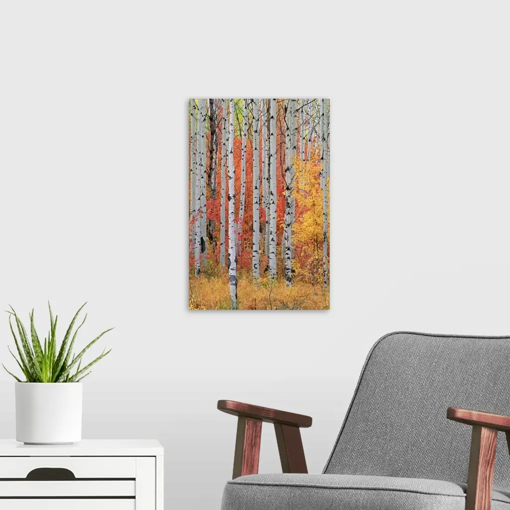 A forest of aspen and maple trees in the Wasatch mountains, with striking yellow and red autumn foliage.