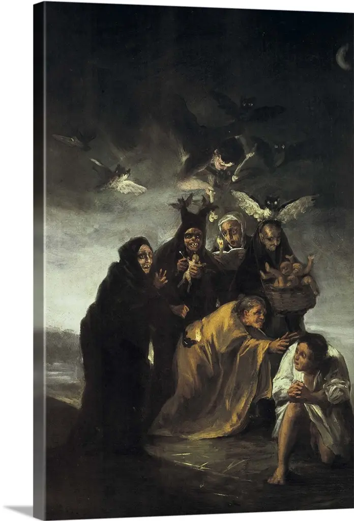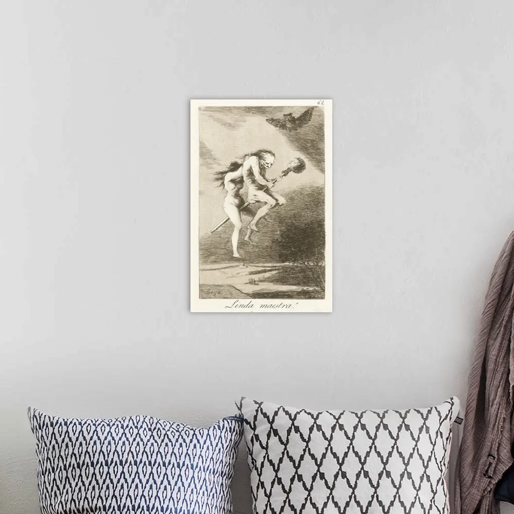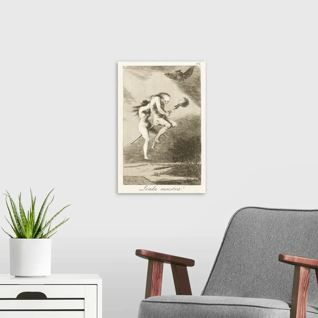 A Good Mistress, by Francisco Goya, 1797-99, Spanish print, drypoint, etching, on paper. Witches, old and a young apprentice, flying on broomstick, above a landscape. This satirical etching targeted ignorance and superstition, was in Goya's 'Los Caprichos