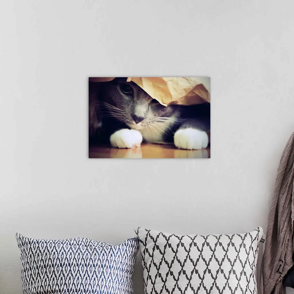 A gray kitten peeks out from beneath a brown paper bag on the floor. wall art for home and office decor. Discover canvas art prints, photos, mural, big canvas art and framed wall art in GreatBigCanvas.com's varied collections.
