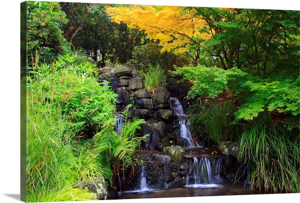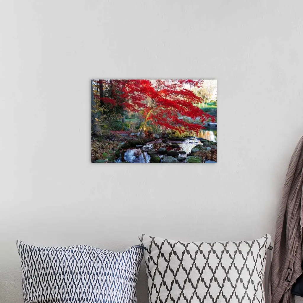 A Japanese maple with colorful, red foliage at a stream's edge.