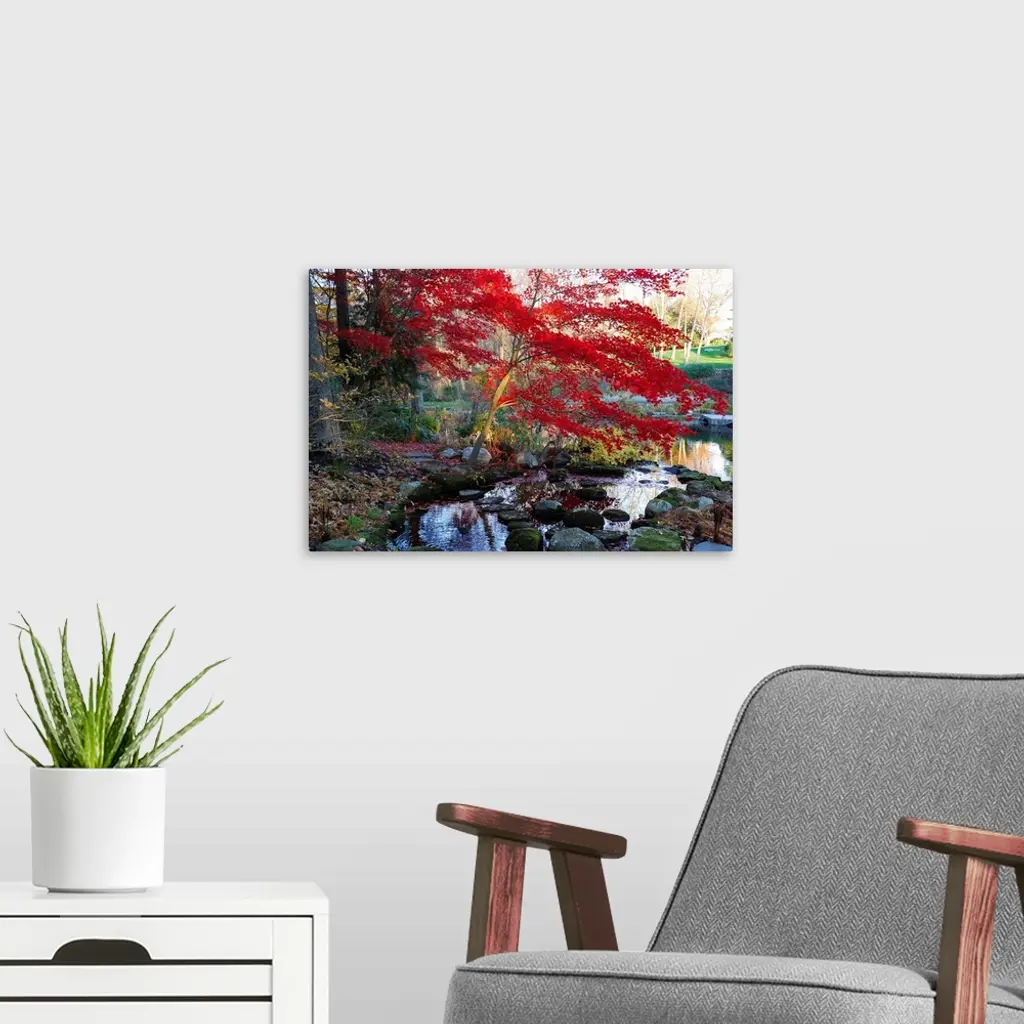A Japanese Maple With Colorful, Red Foliage At A Stream's Edge.; New York.