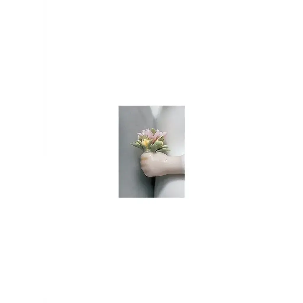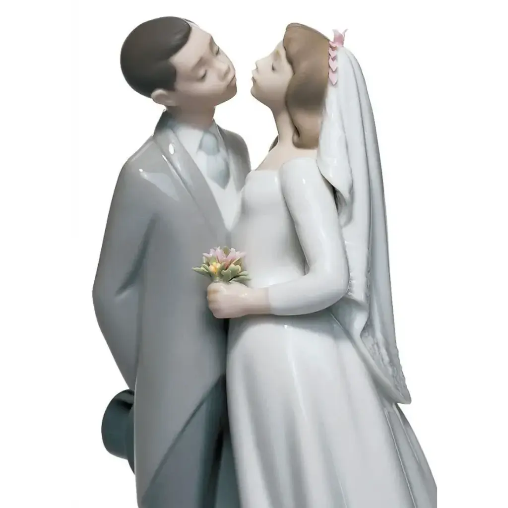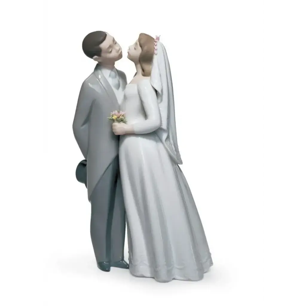 Glossy porcelain figurine of a kiss from the bride and groom with a small bouquet of flowers and floral ornaments holding the veil. An iconic Spanish brand, Lladro is a world leader in the creation of porcelain art. Started by brothers Juan, Jose and Vicente Lladro in 1953, the ceramic figurines were initially inspired by the works of great European manufacturers like Meissen and Sevres. Over time, a unique style was forged, consisting of elongated lines, a revolutionary single-firing method, and soft pastel tones.