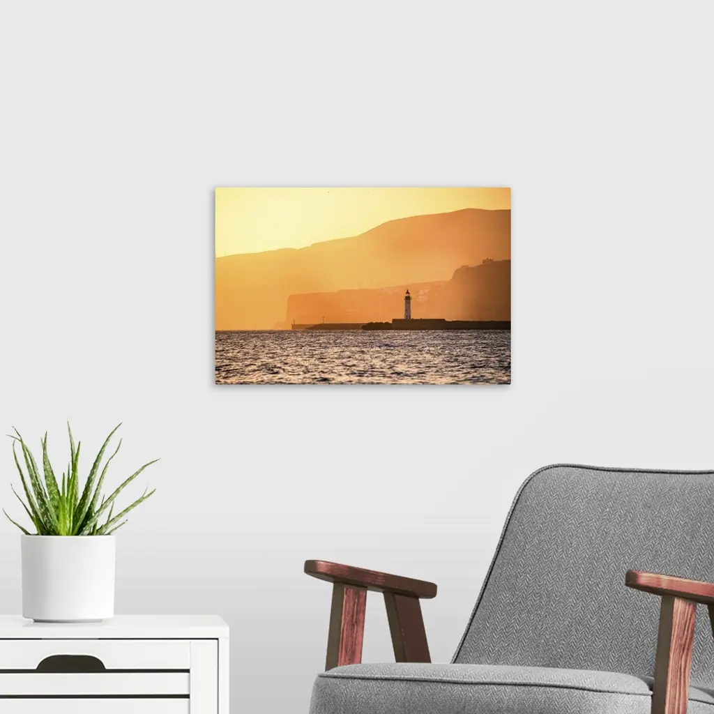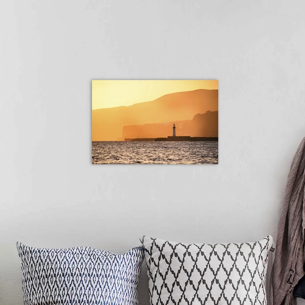A lighthouse stands against golden coastal cliffs in Almeria, Spain, as the sunset casts a warm glow over the sea and landscape