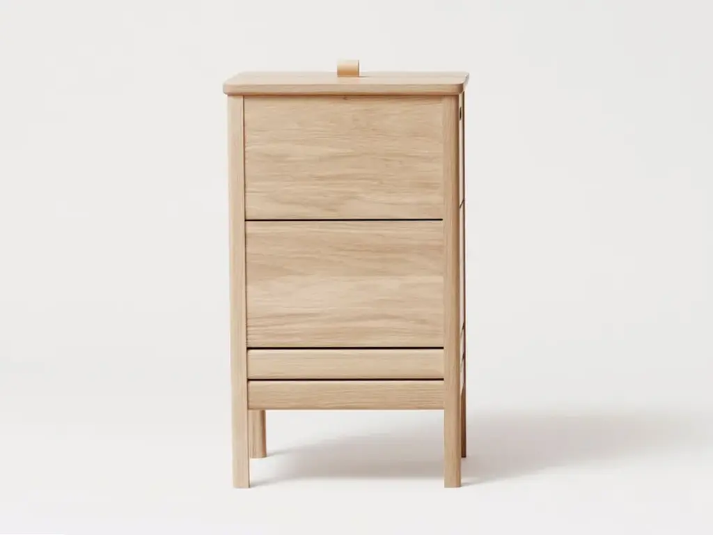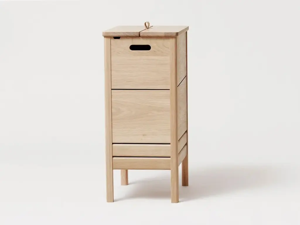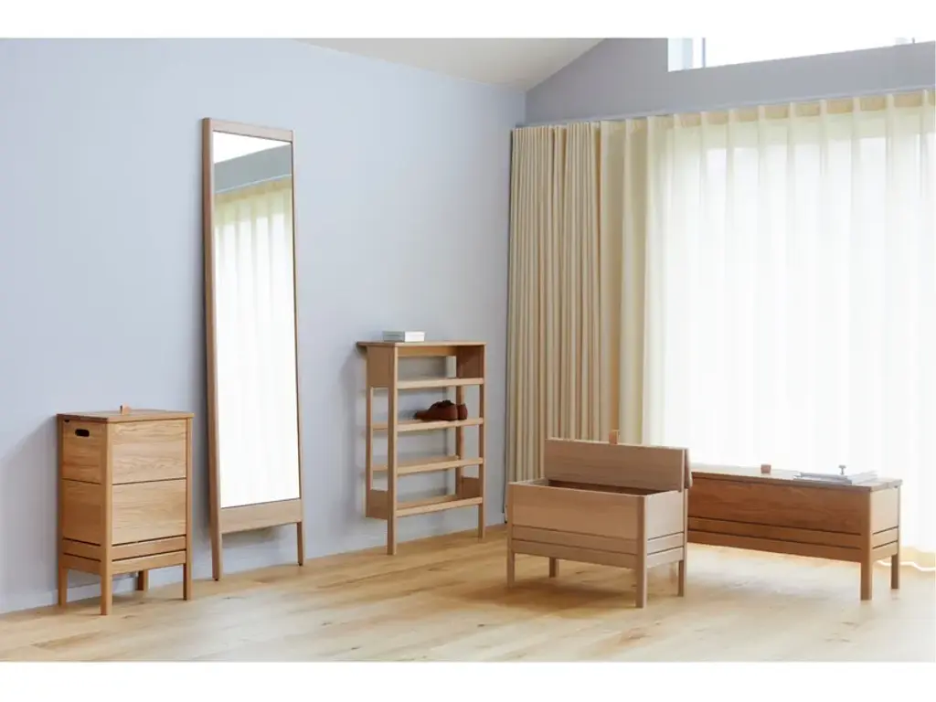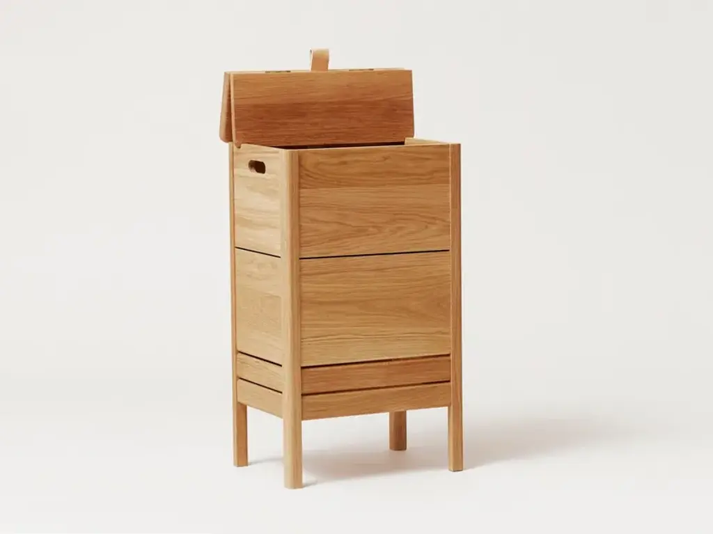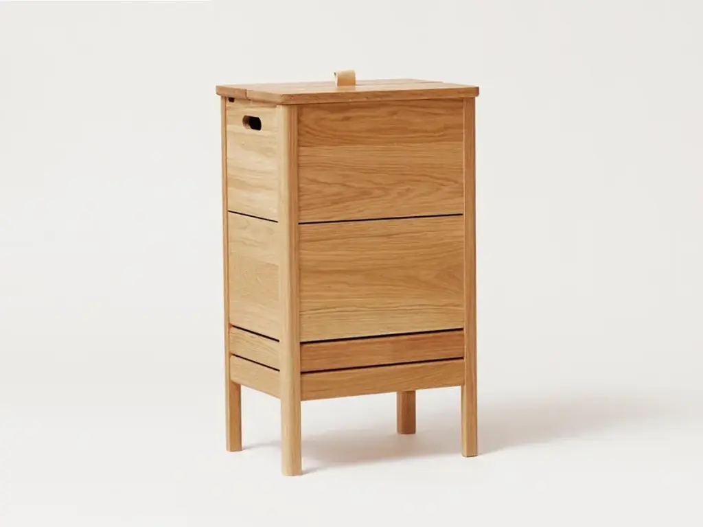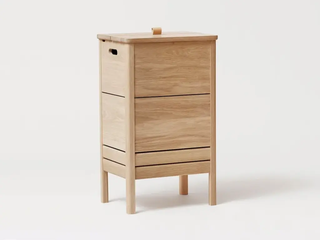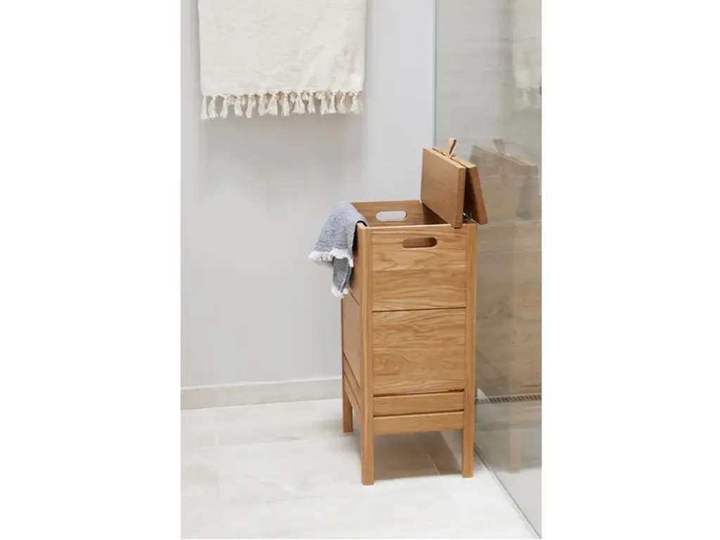 A line is a laundry container made of solid oak, solid and robust. It is a very practical object with a large storage space. The lid can be lifted thanks to a small leather handle, there are also handles on each side that allow to easily move the laundry box during use. The two small openings allow the air inside the box to naturally ventilate, an important feature for a laundry box."Our wish was to create a classic, yet simple laundry box with beautiful details around the lid. The elongated format adds to a refined appearance that takes up minimal space wherever placed." Herman StudioA Line is a collection of functional furniture made with a mix of rediscovered classics and new reinterpretations of furniture elements. The series consists of a storage bench, a mirror, a shoe rack and a laundry container, was designed to furnish the spaces of the house and ensure functional containment spaces.