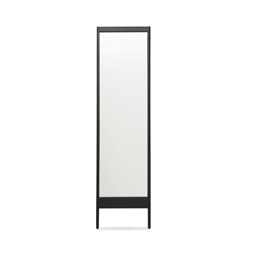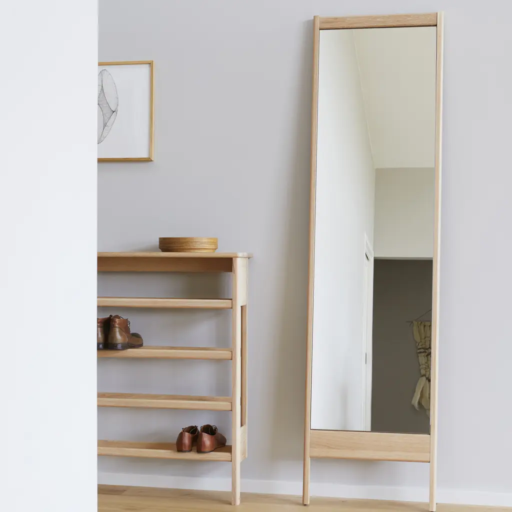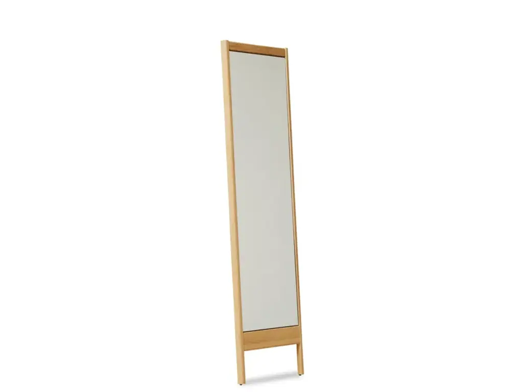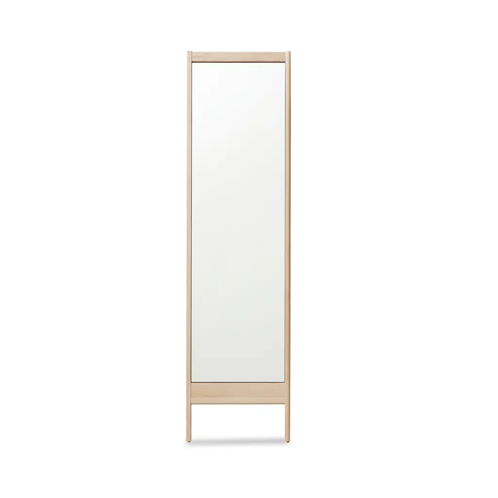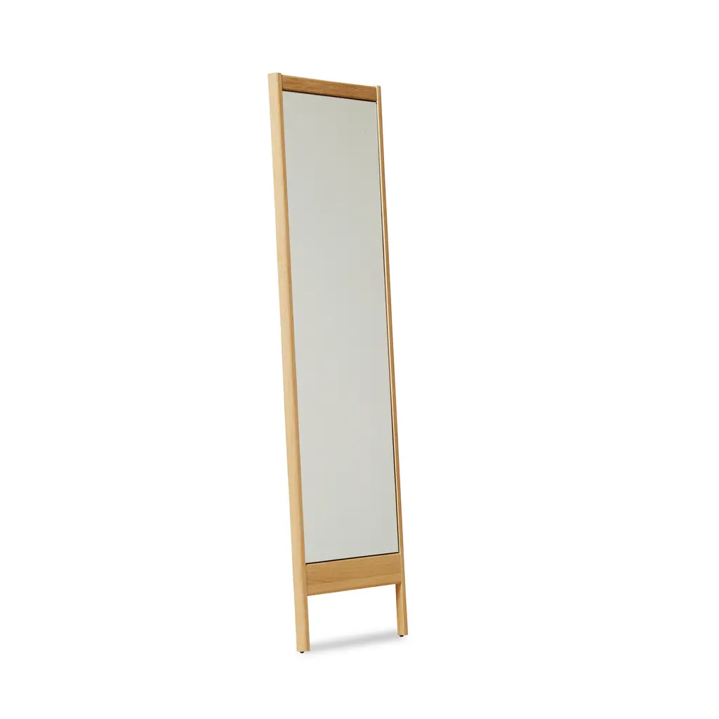 The A Line Mirror presents a minimalist design as a free-standing, two-legged mirror, tailored to accommodate various needs with its considerable height. The distinctive rhombus-shaped legs contribute not only to a more intricate visual presence but also ensure a sturdy yet lightweight frame for the mirror itself. Below the reflective surface, a sizeable solid wood piece underscores the mirror’s craftsmanship, adding a touch of artisanal quality. This mirror is designed to lean gracefully against the wall, eliminating the need for any fixtures, which allows for easy placement and relocation in any room.