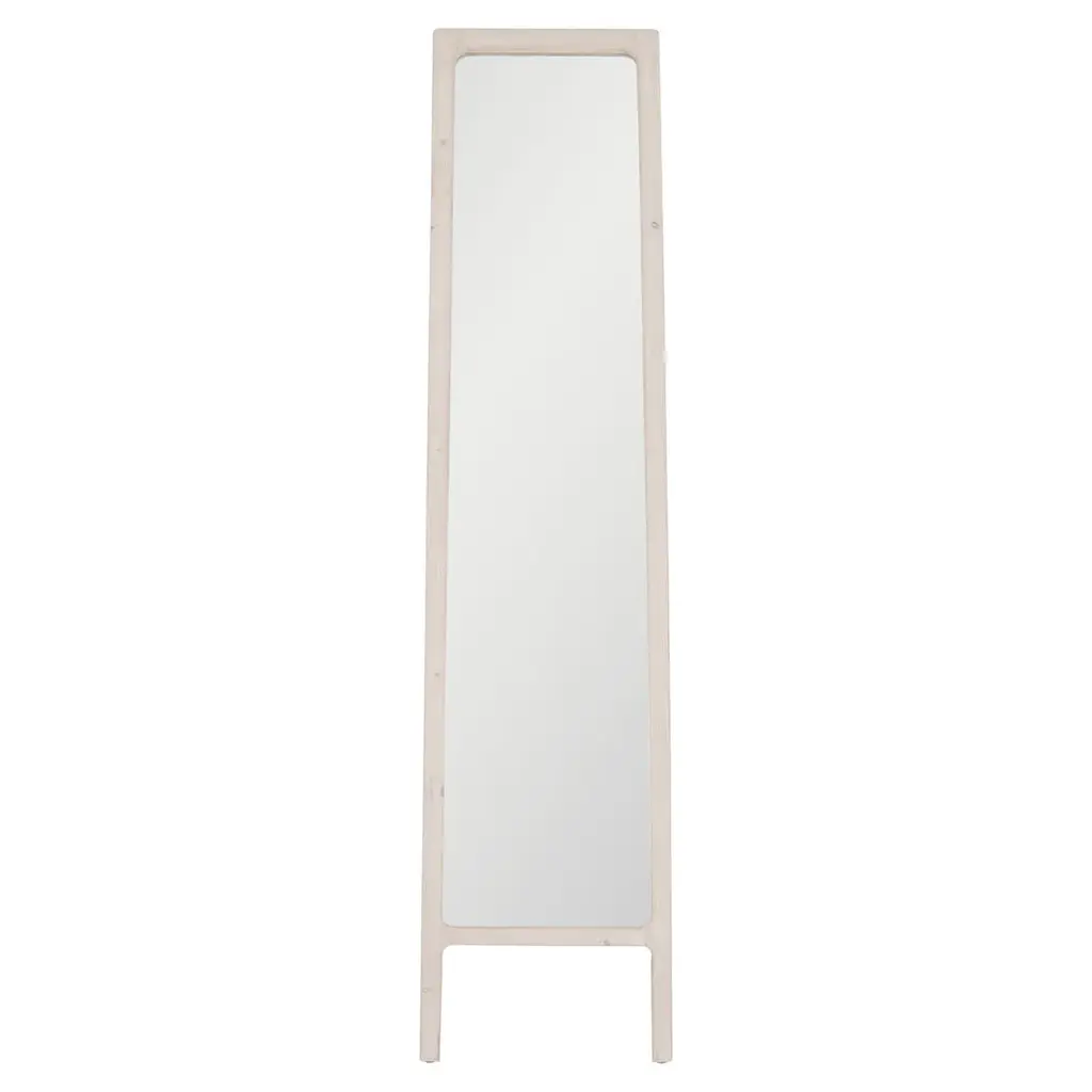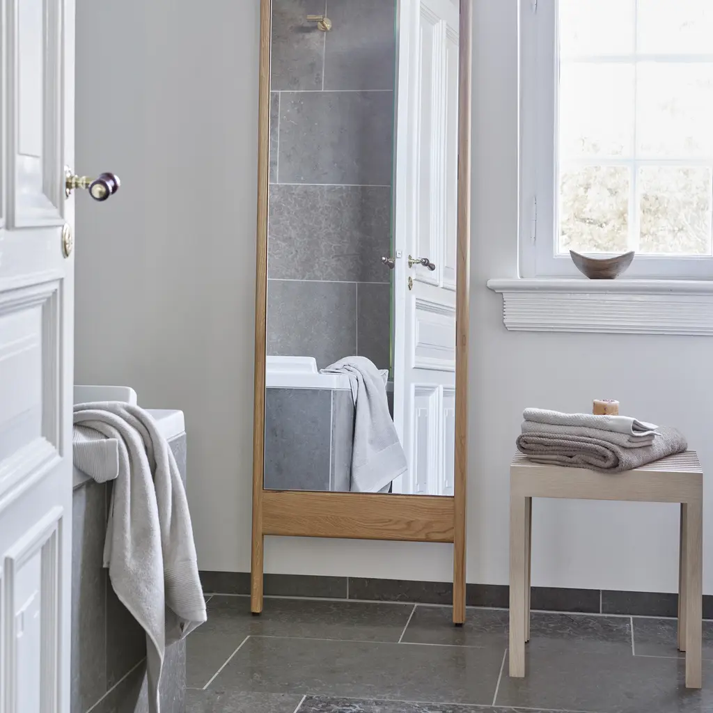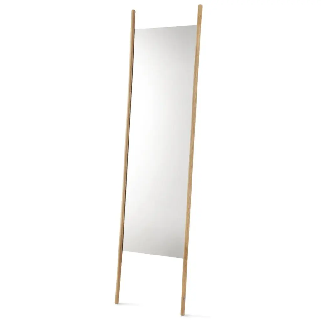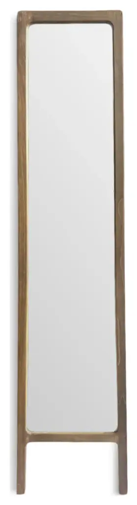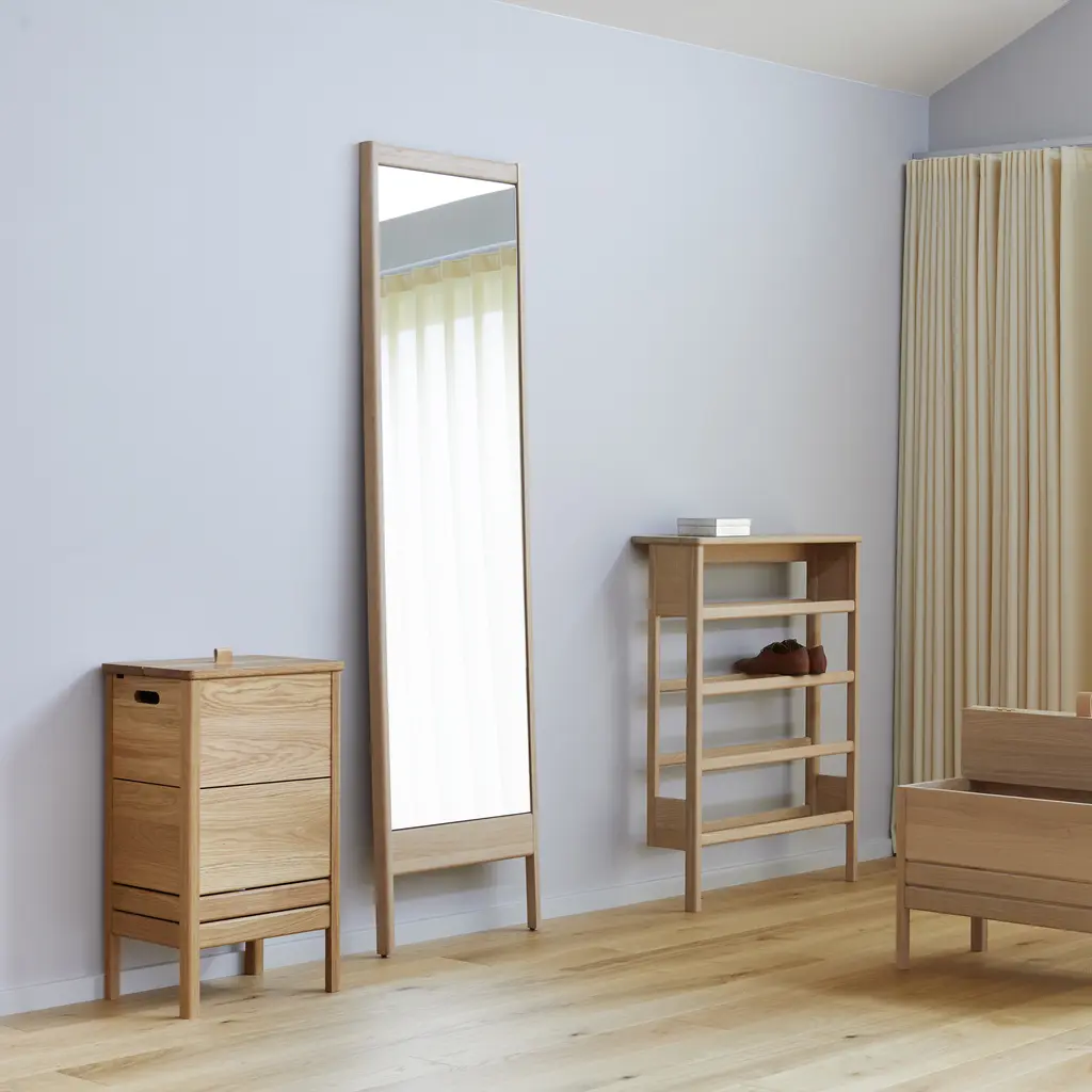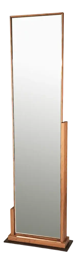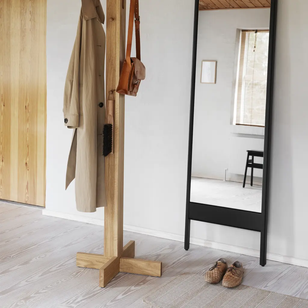 The A Line Mirror presents a minimalist design as a free-standing, two-legged mirror, tailored to accommodate various needs with its considerable height. The distinctive rhombus-shaped legs contribute not only to a more intricate visual presence but also ensure a sturdy yet lightweight frame for the mirror itself. Below the reflective surface, a sizeable solid wood piece underscores the mirror’s craftsmanship, adding a touch of artisanal quality. This mirror is designed to lean gracefully against the wall, eliminating the need for any fixtures, which allows for easy placement and relocation in any room.
