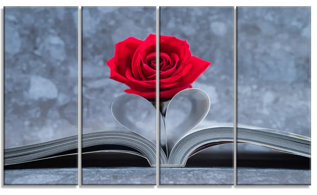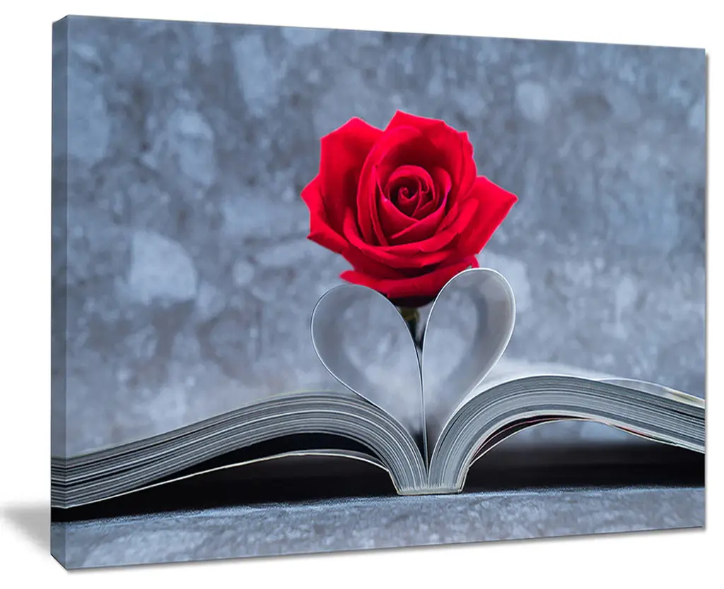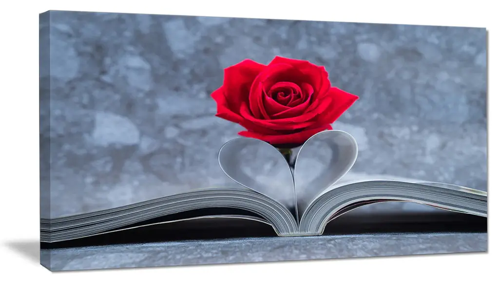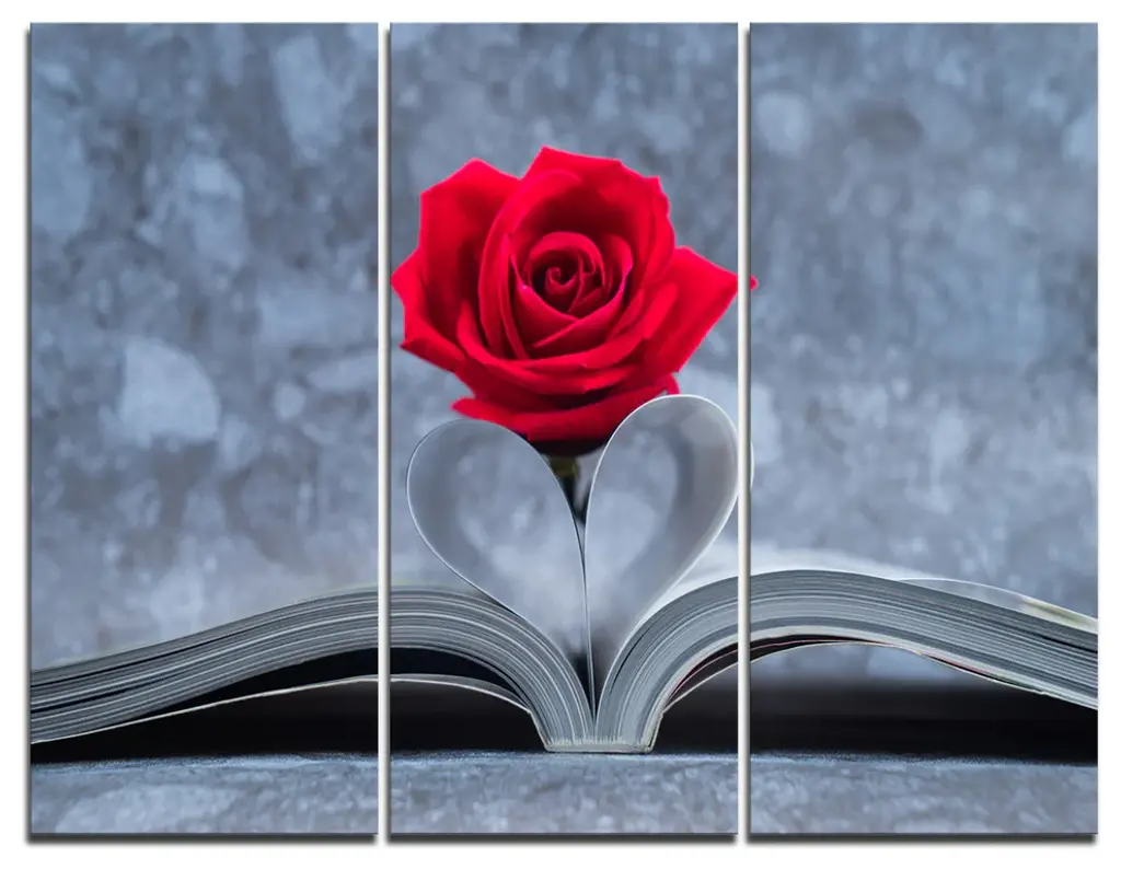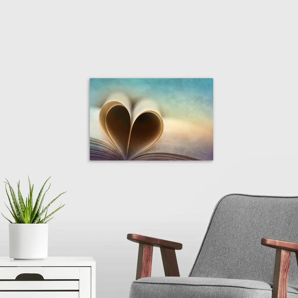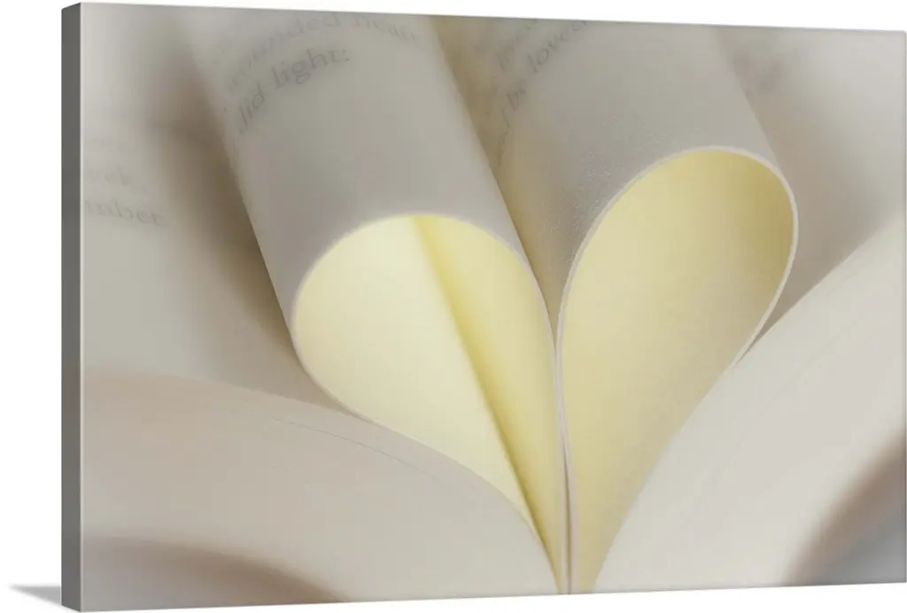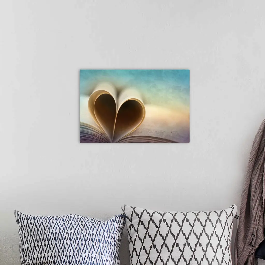 Vintage style rainbow photograph of an open book with the pages folded in the shape of a heart.