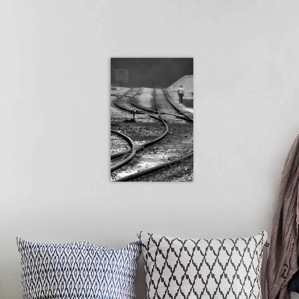 A man walking beside curving railway tracks