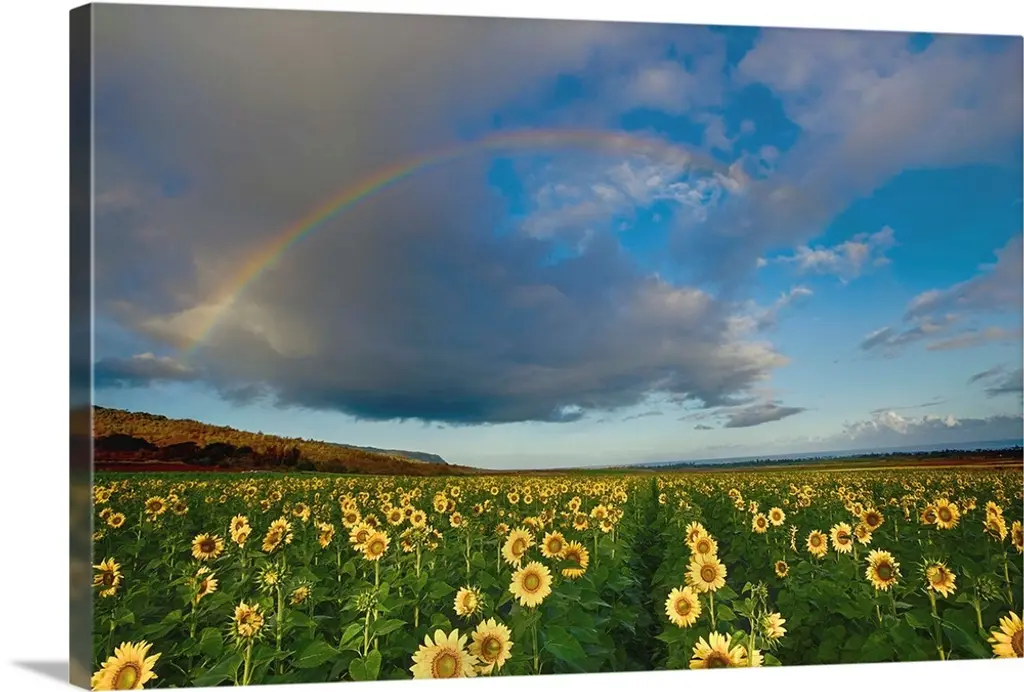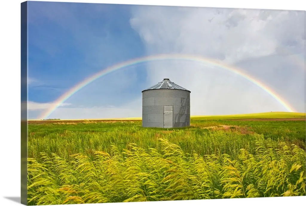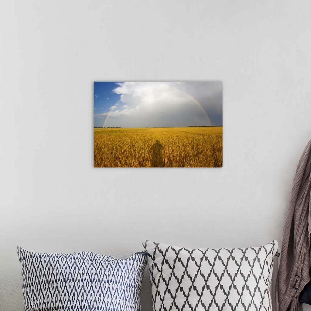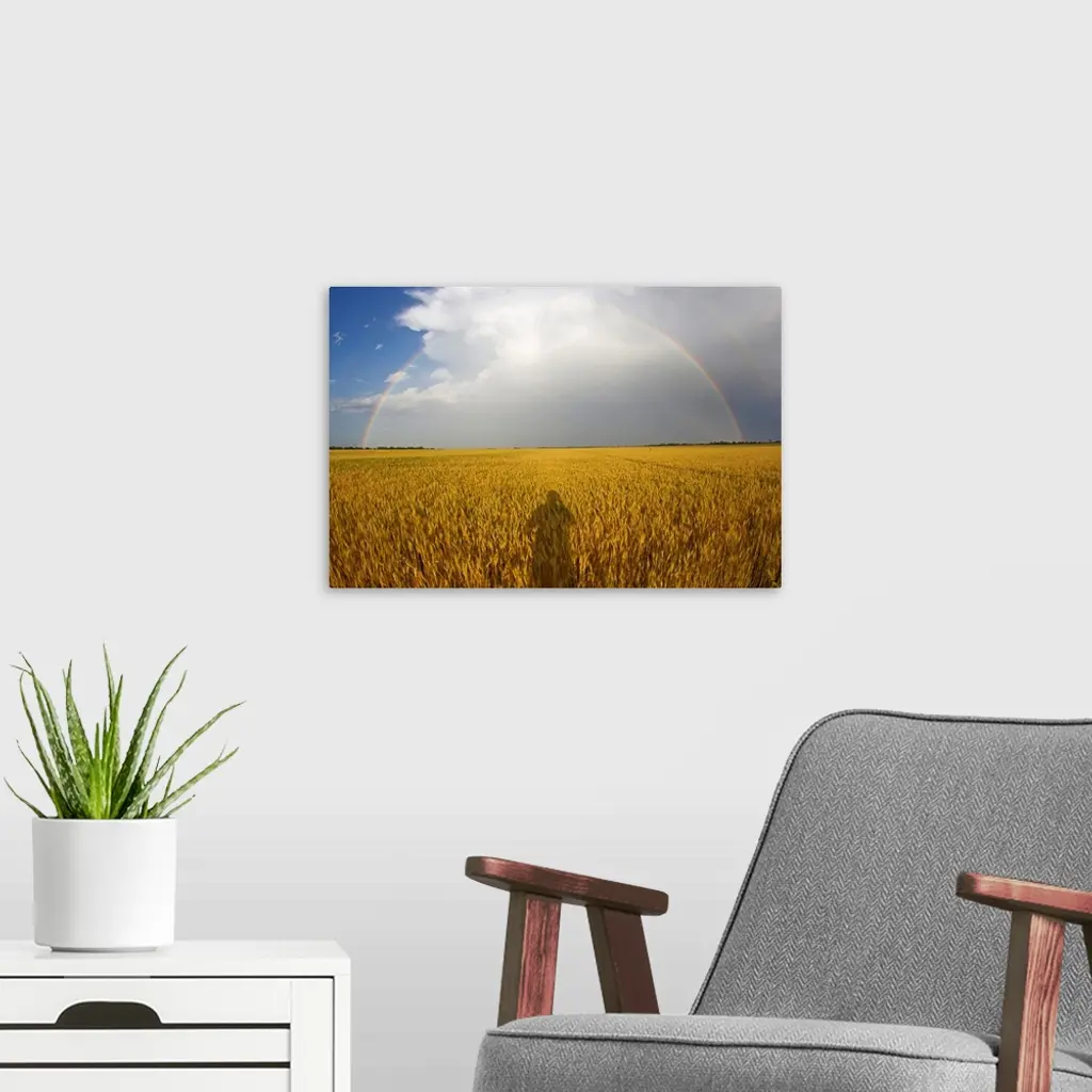 A Man's Shadow On A Wheat Field With A Rainbow Behind A Passing Storm