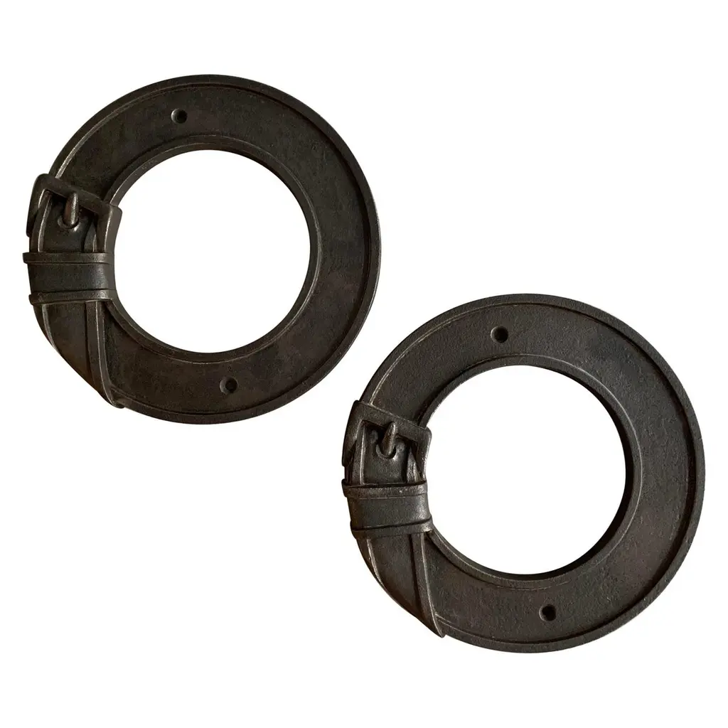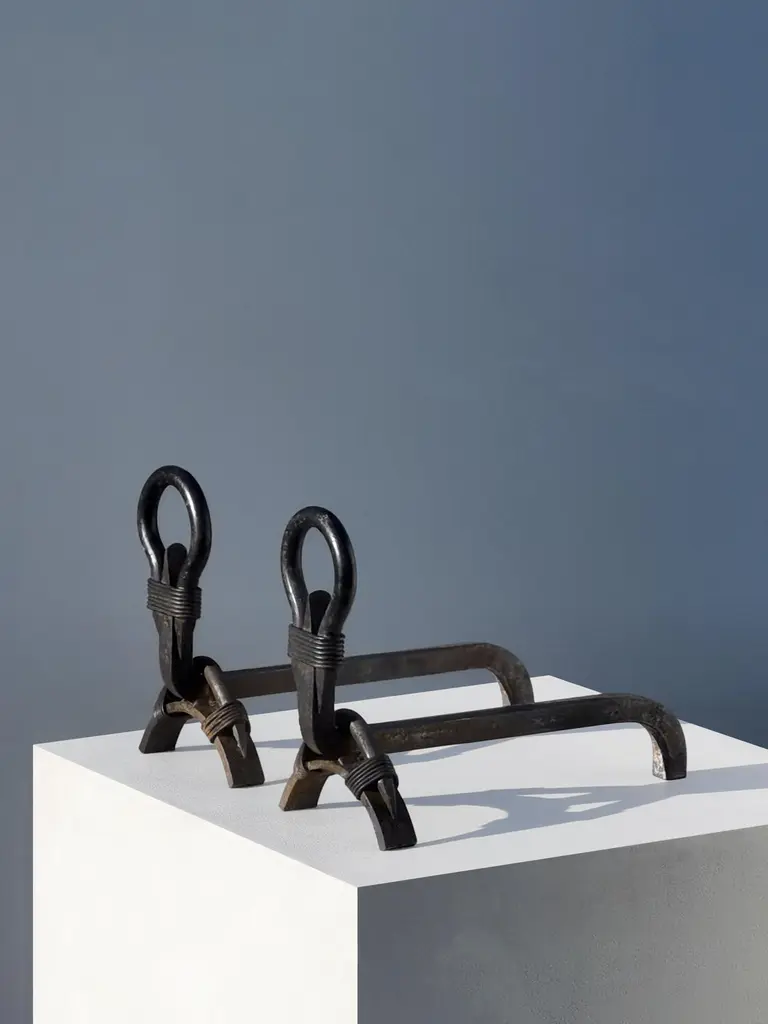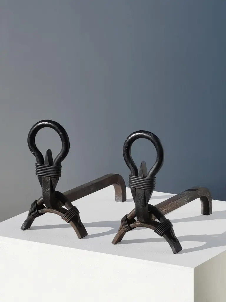 A strong and singular pair of andirons, Mid-Century-Modern, Modernist, Brutalist, to be attributed, massive wrought iron structures strongly characterised by their "ring heads" and their 'iron wirings" connecting the different elements, by yet anonymous craftsman, to be attributed, France 1950. Each Piece measures 35 x 25 x 14.5 cmRARE & IMPORTANT TO MENTION : 2 PAIRS, found separately, ARE AVAILABLE...