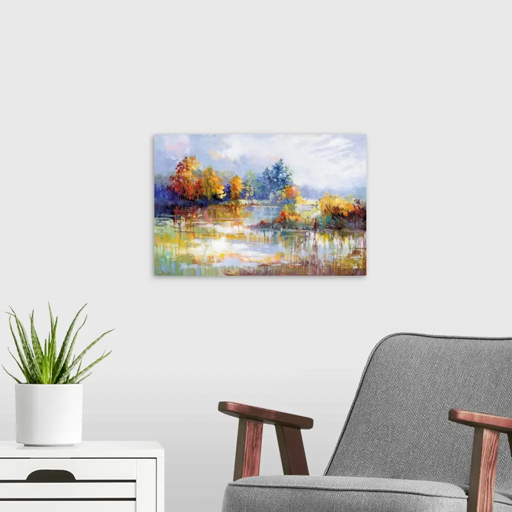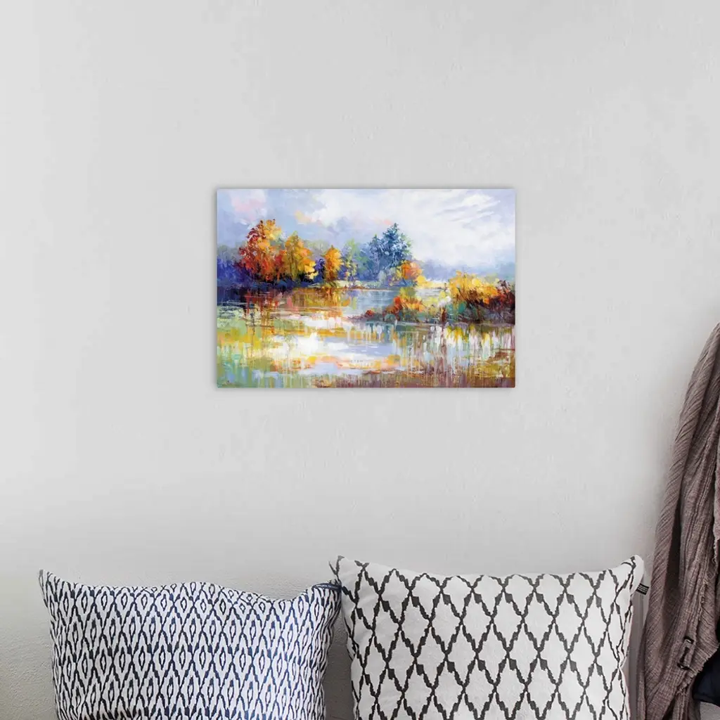 This colorful autumn abstract landscape by Leon Devenice captures the warmth of nature with bold brushwork and vibrant lake reflections, offering a dreamy moment of stillness and light. A perfect piece of wall art that fills the room with the glow of falls beauty.