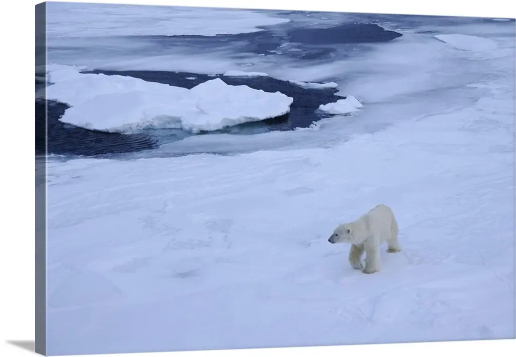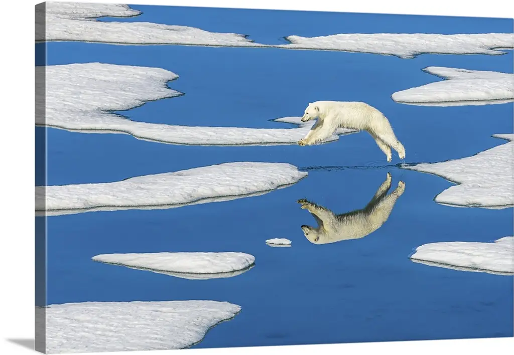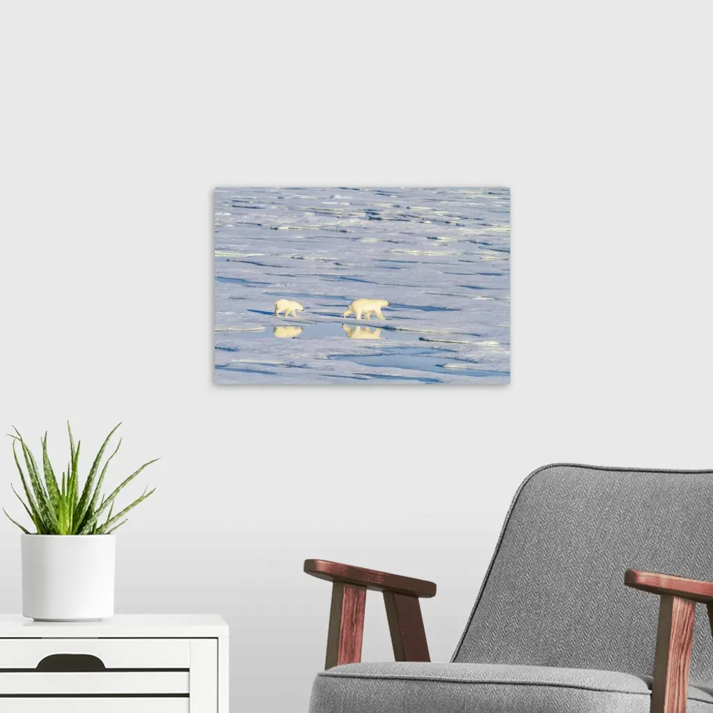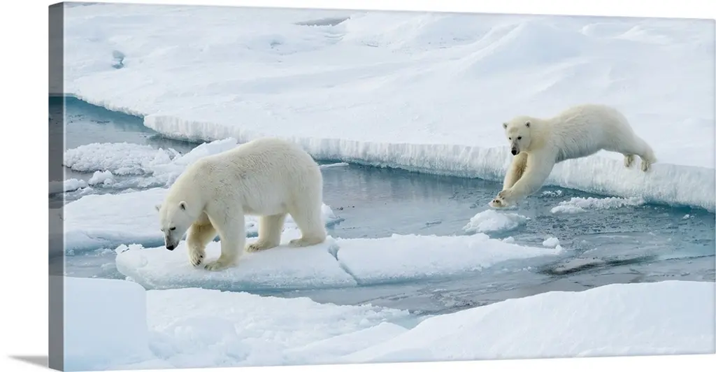 A mother and cub polar bear (Ursus maritimus) traveling from ice floe to ice floe in the Svalbard Archipelago, Norway, Arctic, Europe