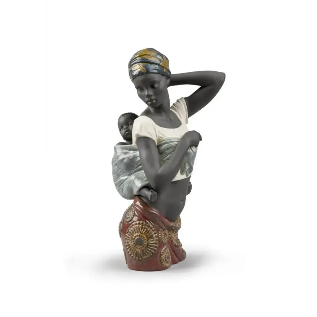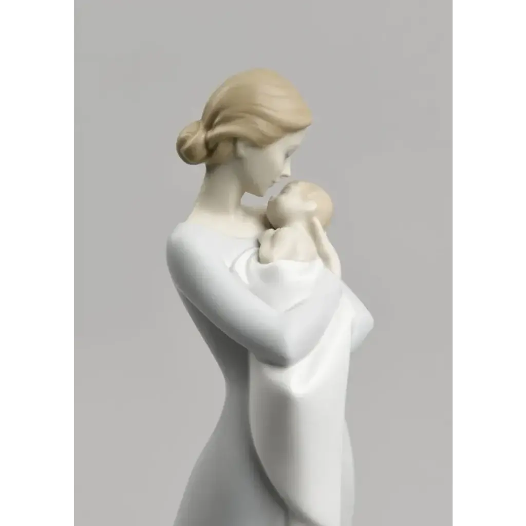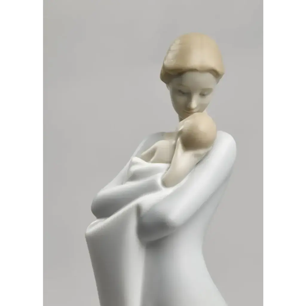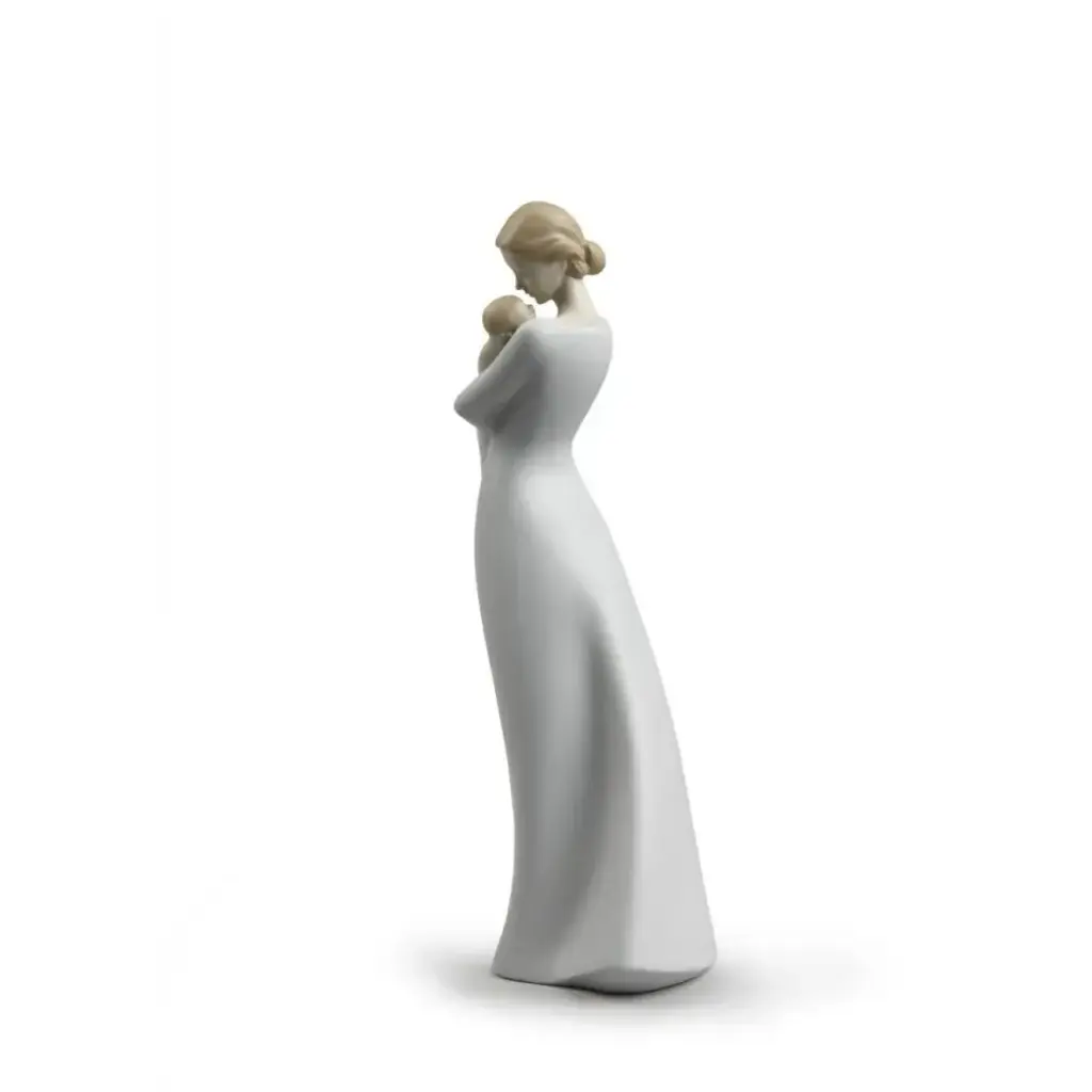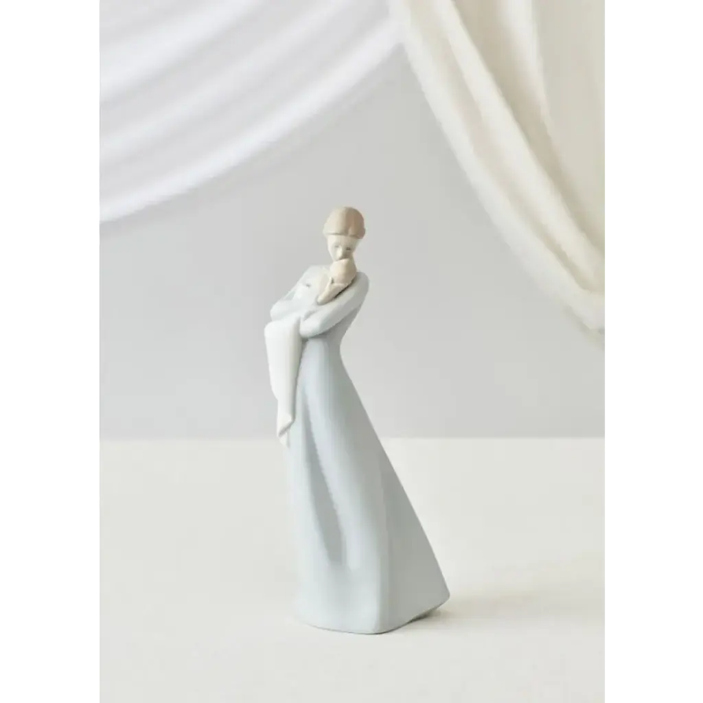 Mother figurine in matte satin green porcelain with her baby in her arms wrapped in a white blanket. An iconic Spanish brand, Lladro is a world leader in the creation of porcelain art. Started by brothers Juan, Jose and Vicente Lladro in 1953, the ceramic figurines were initially inspired by the works of great European manufacturers like Meissen and Sevres. Over time, a unique style was forged, consisting of elongated lines, a revolutionary single-firing method, and soft pastel tones.