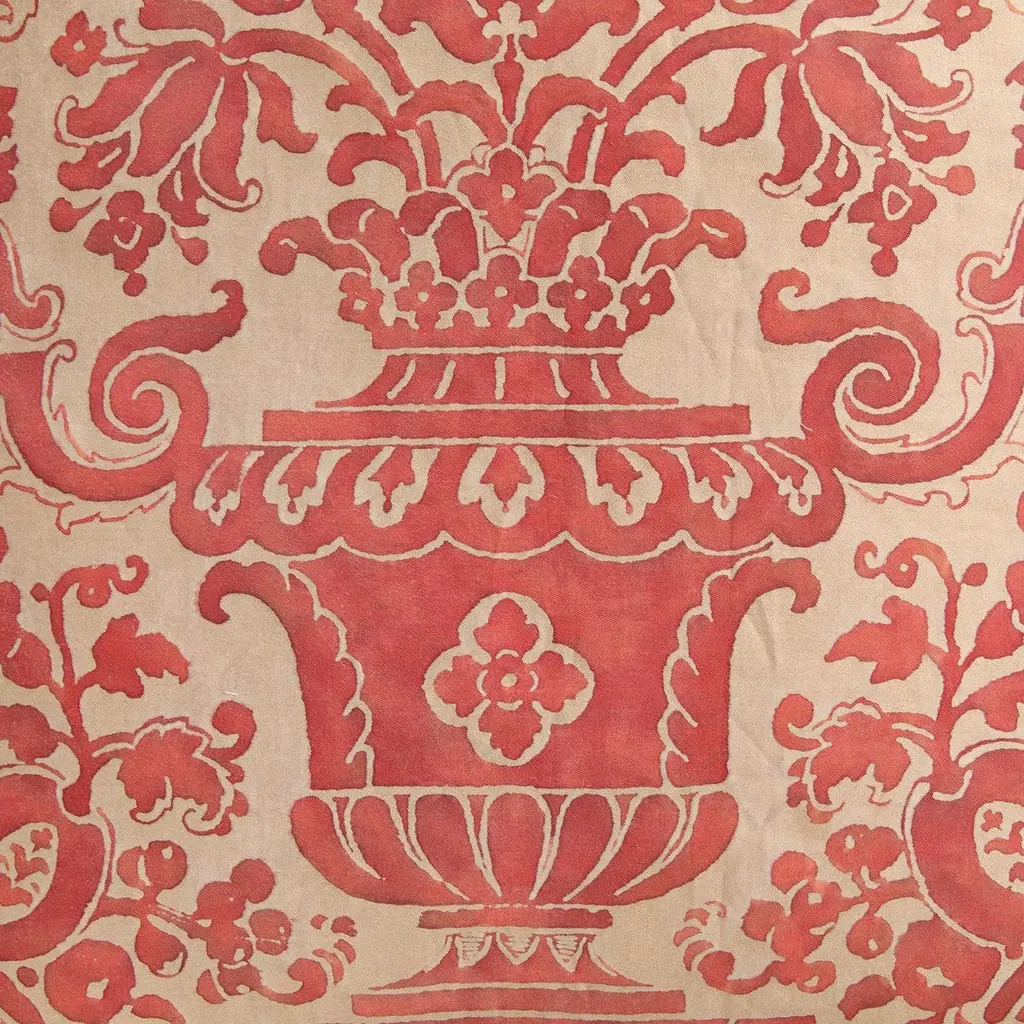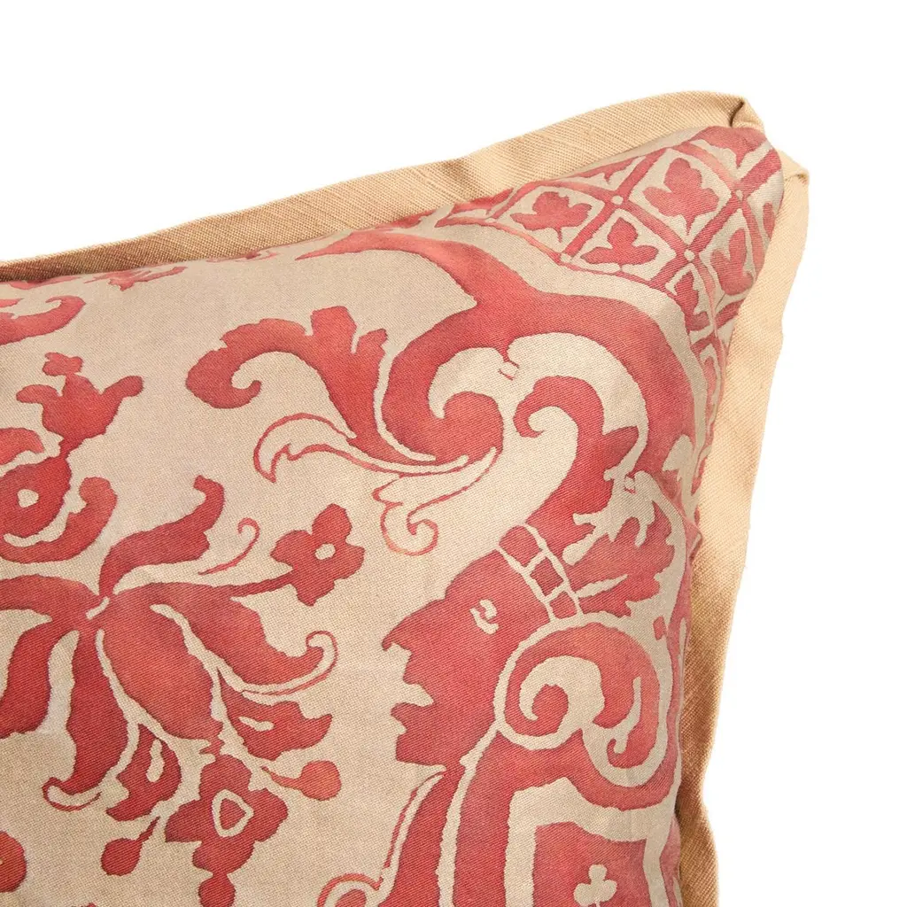 A Pair of Fortuny cushions in the Carnavalet pattern in rust and silvery gold. With Thai silk bias edging and backs. 2 pairs available.
