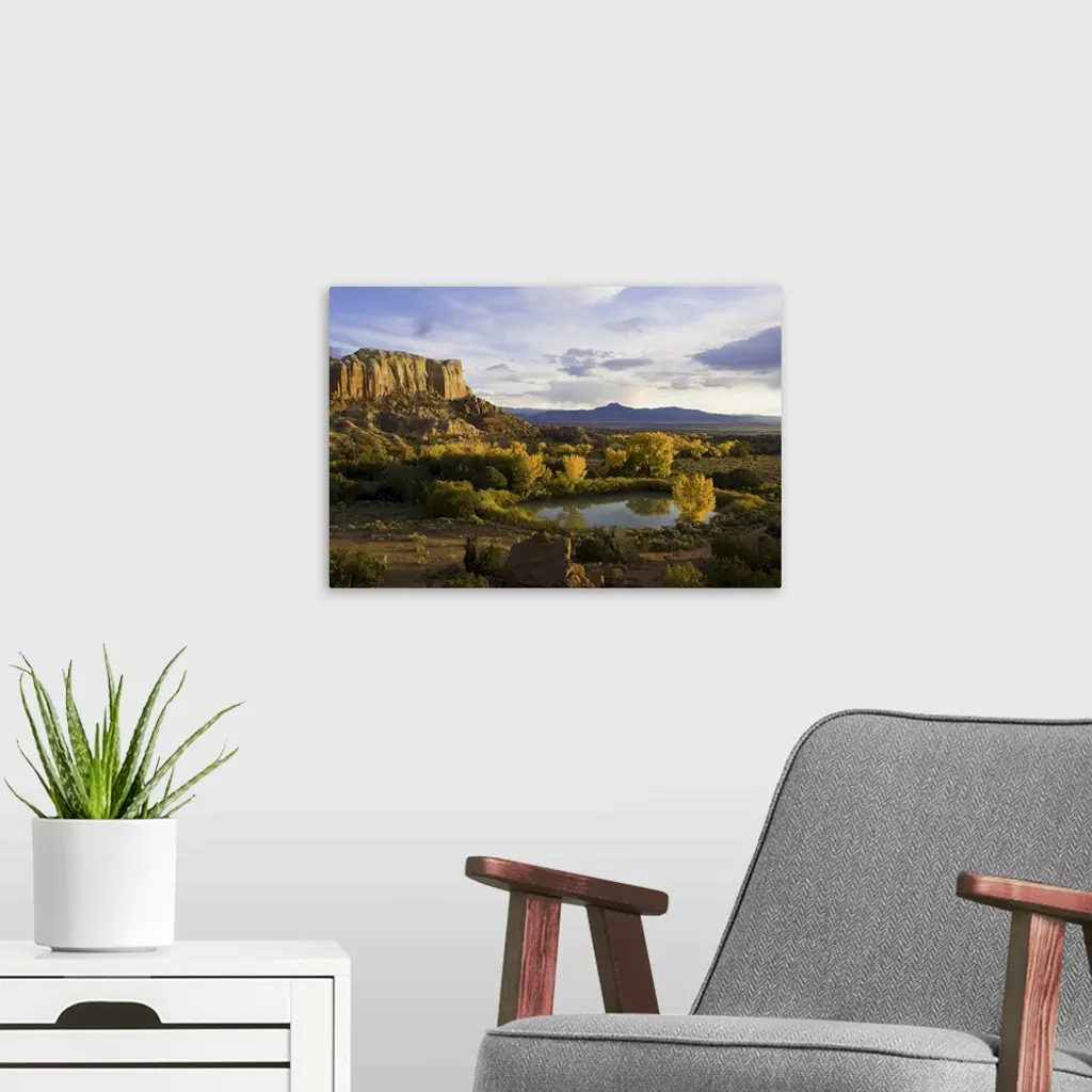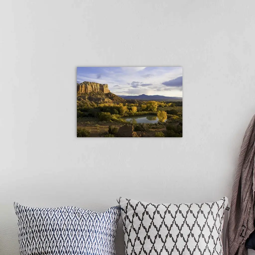 A pond is seen next to Kitchen Mesa with Pedernal Peak in the distance.