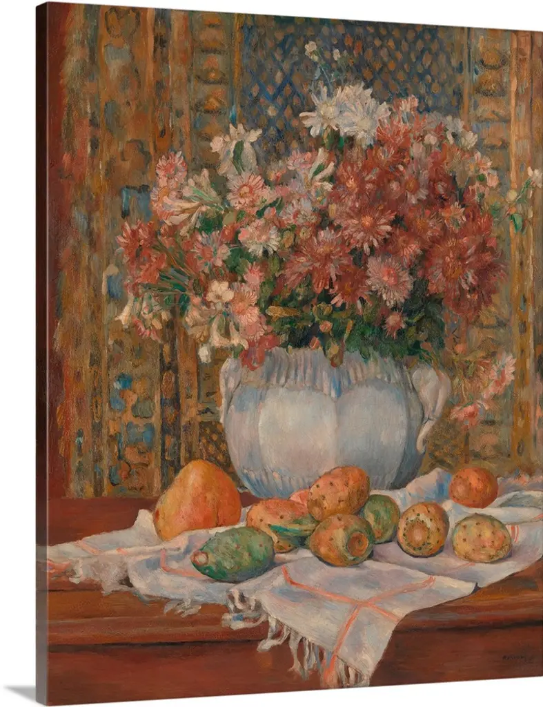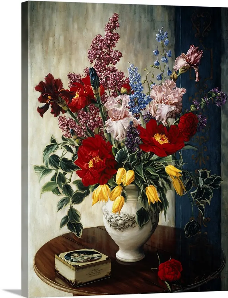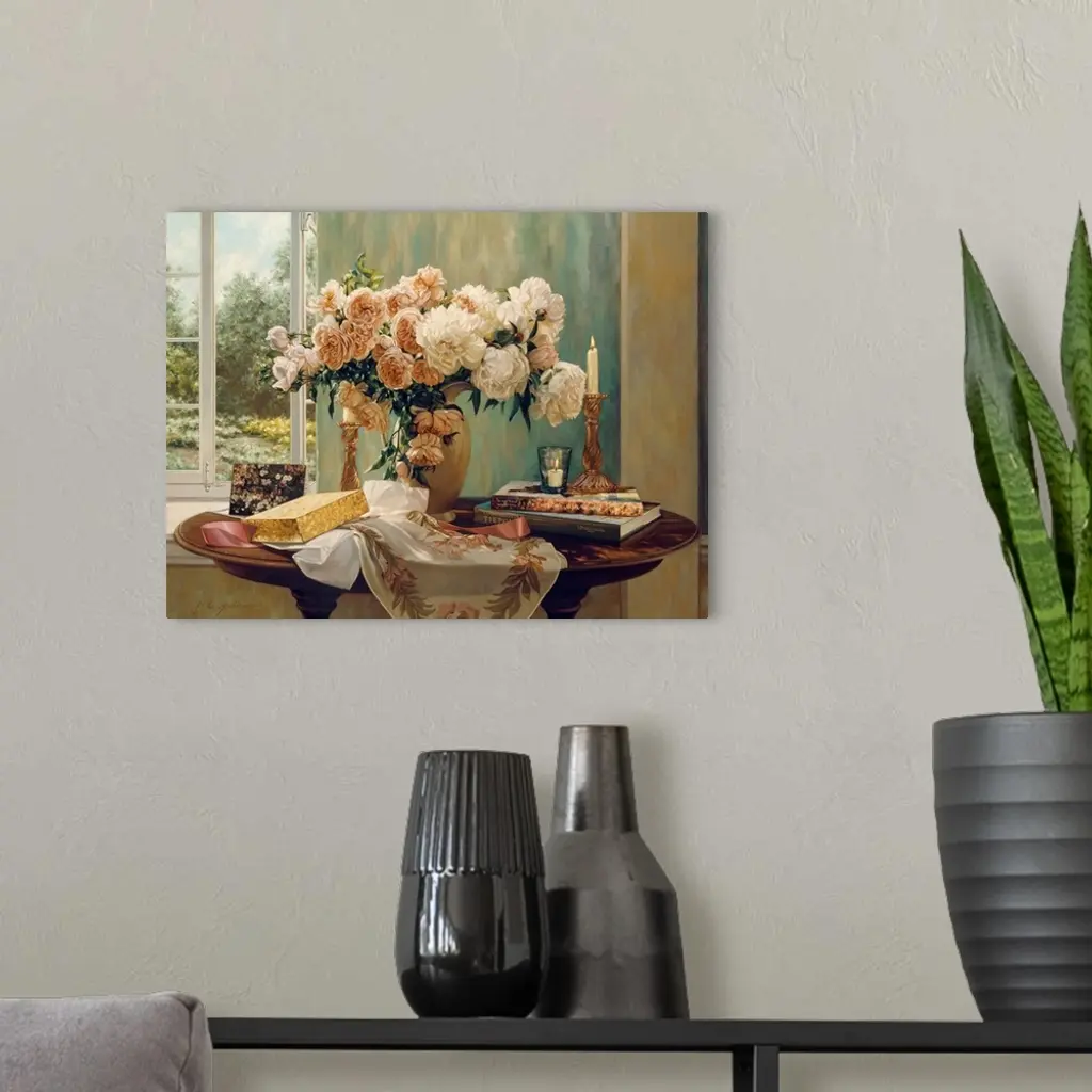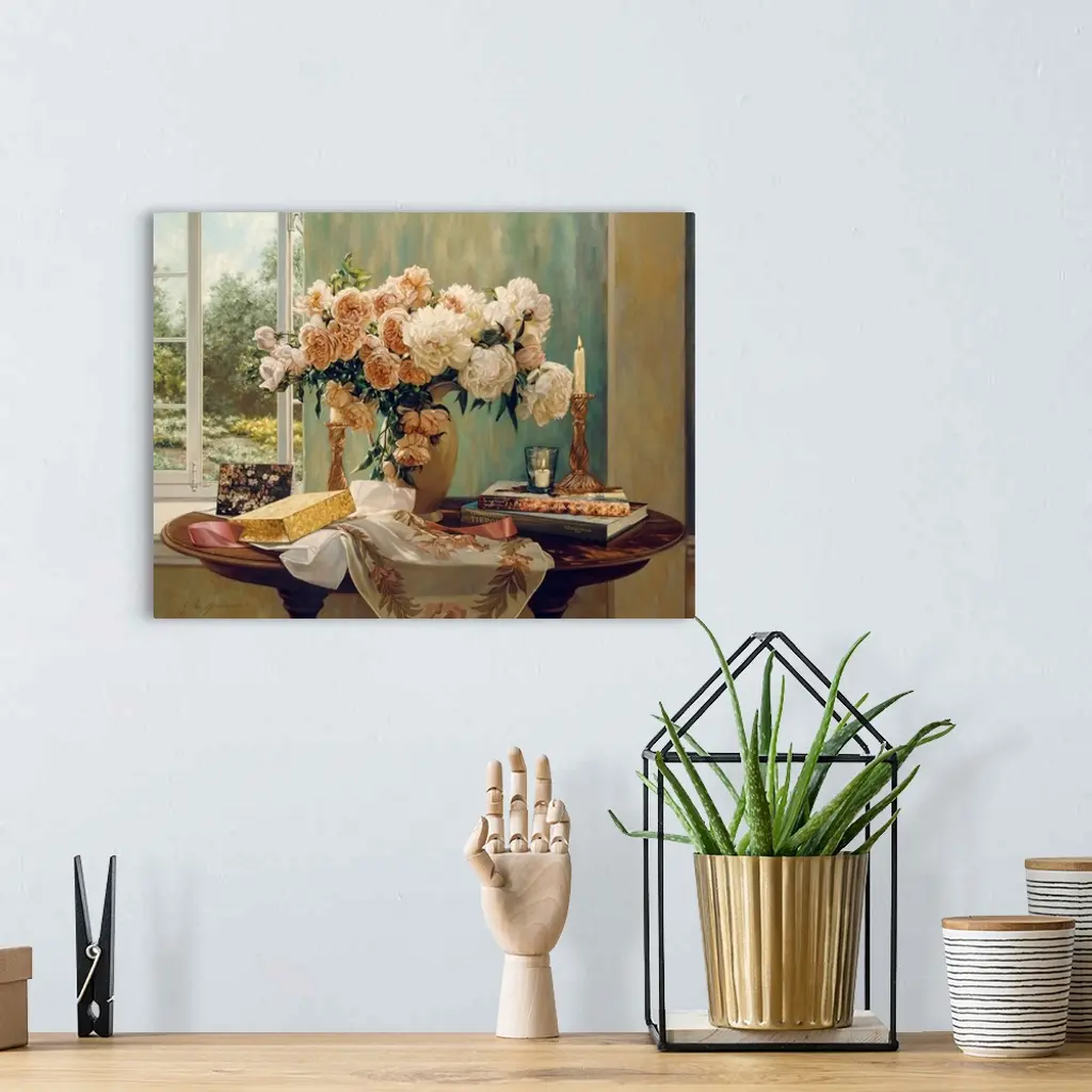 A vase of white and peach flowers on a wooden table with two books on one side and a note card and an empty box on the other.