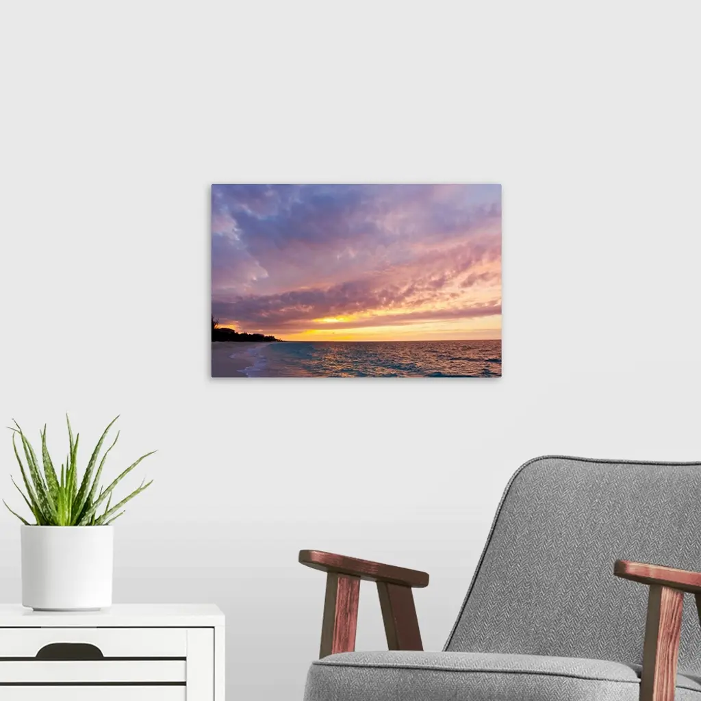 A purple and pink sky at sunset over Grace Bay and the beach.