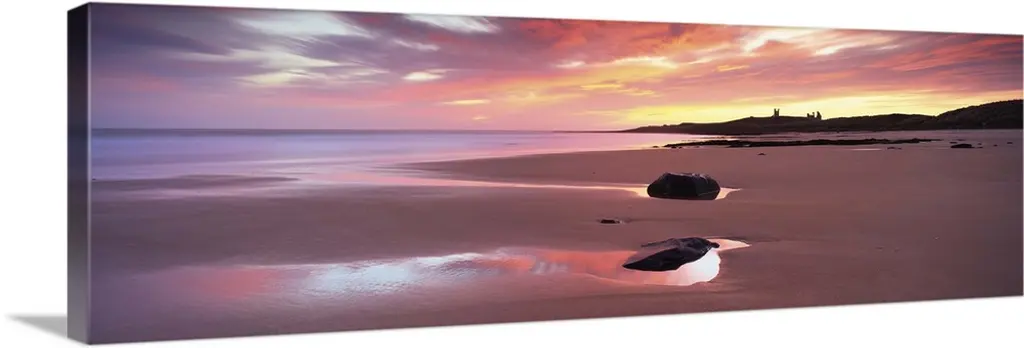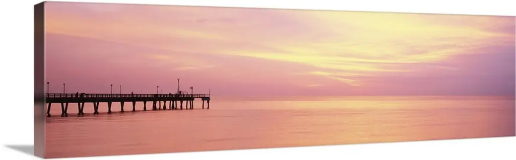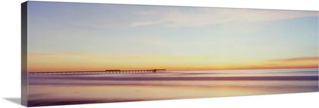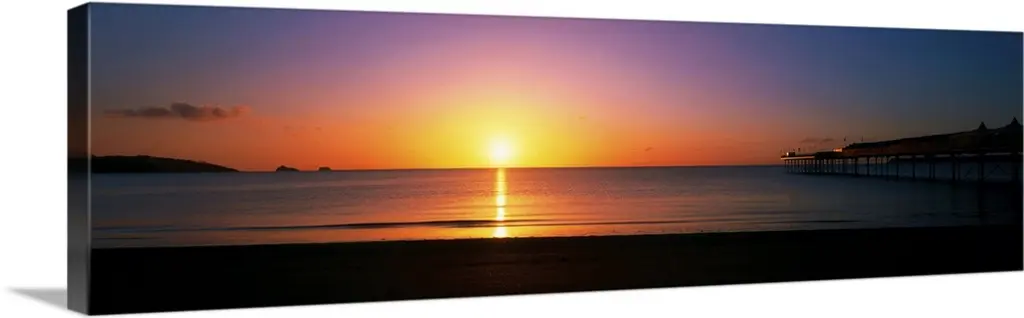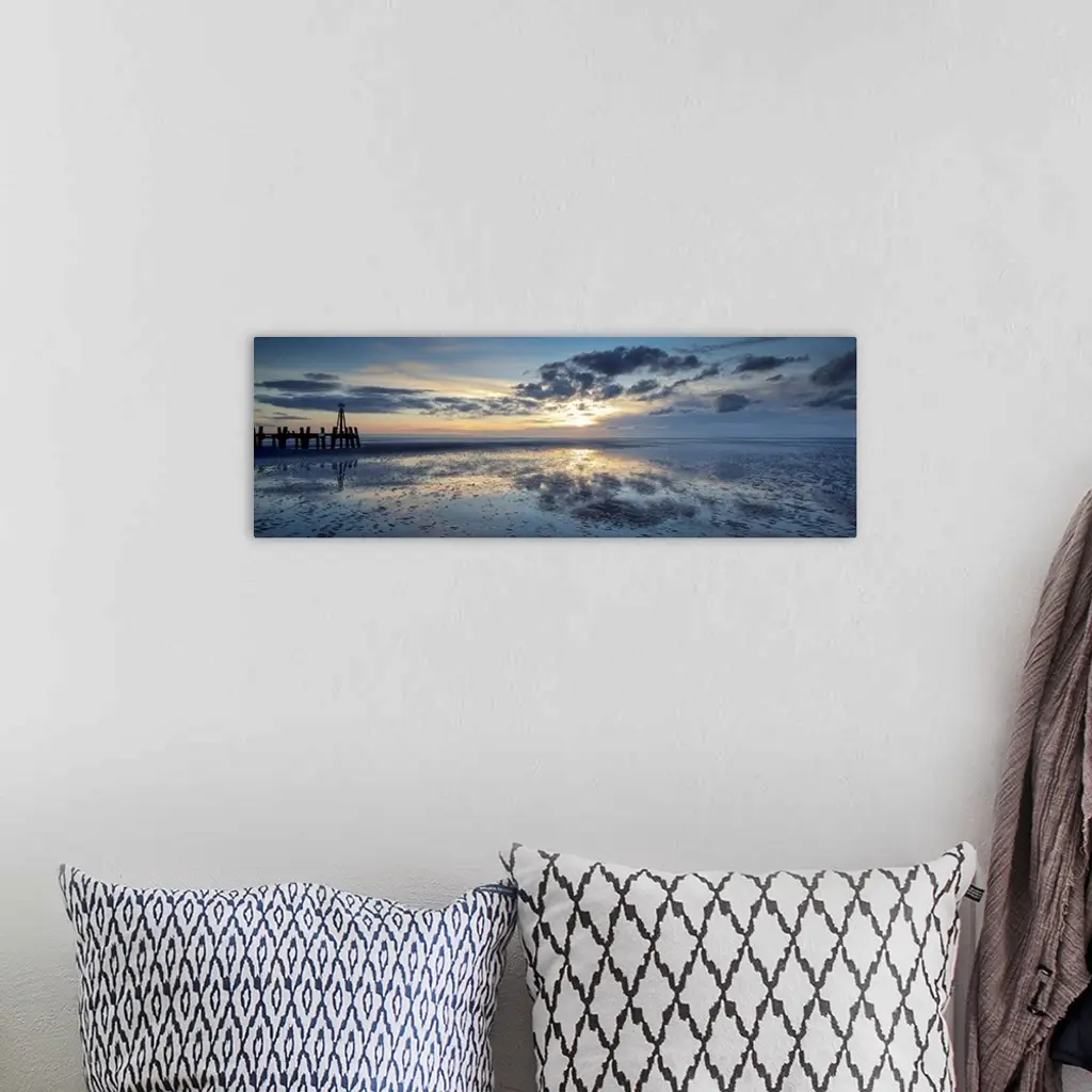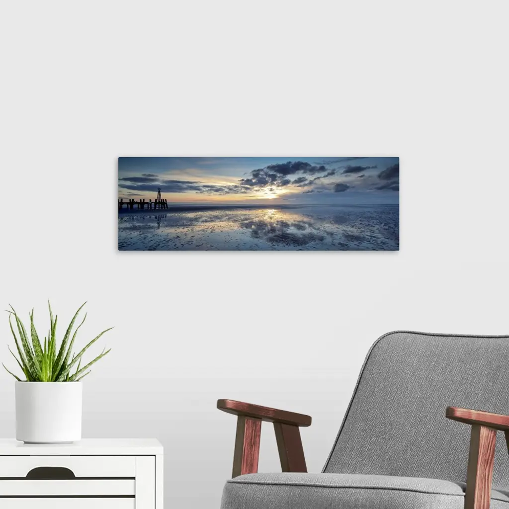 A panoramic image of a tranquil golden blue dawn with fluffy clouds over reflecting wet sand with a harbour installation.