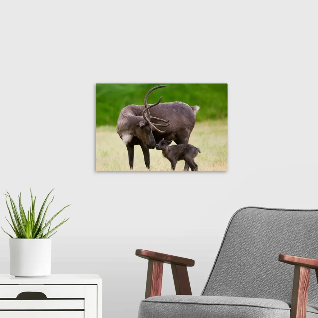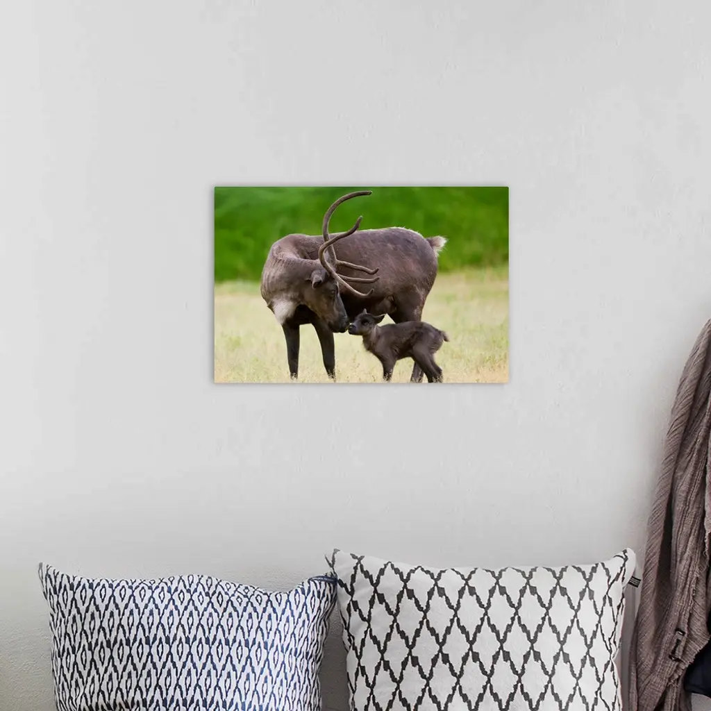 A Reindeer Calf Is Nuzzled By Its Mother In A Grassy Field, Southcentral Alaska wall art for home and office decor. Discover canvas art prints, photos, mural, big canvas art and framed wall art in GreatBigCanvas.com's varied collections.
