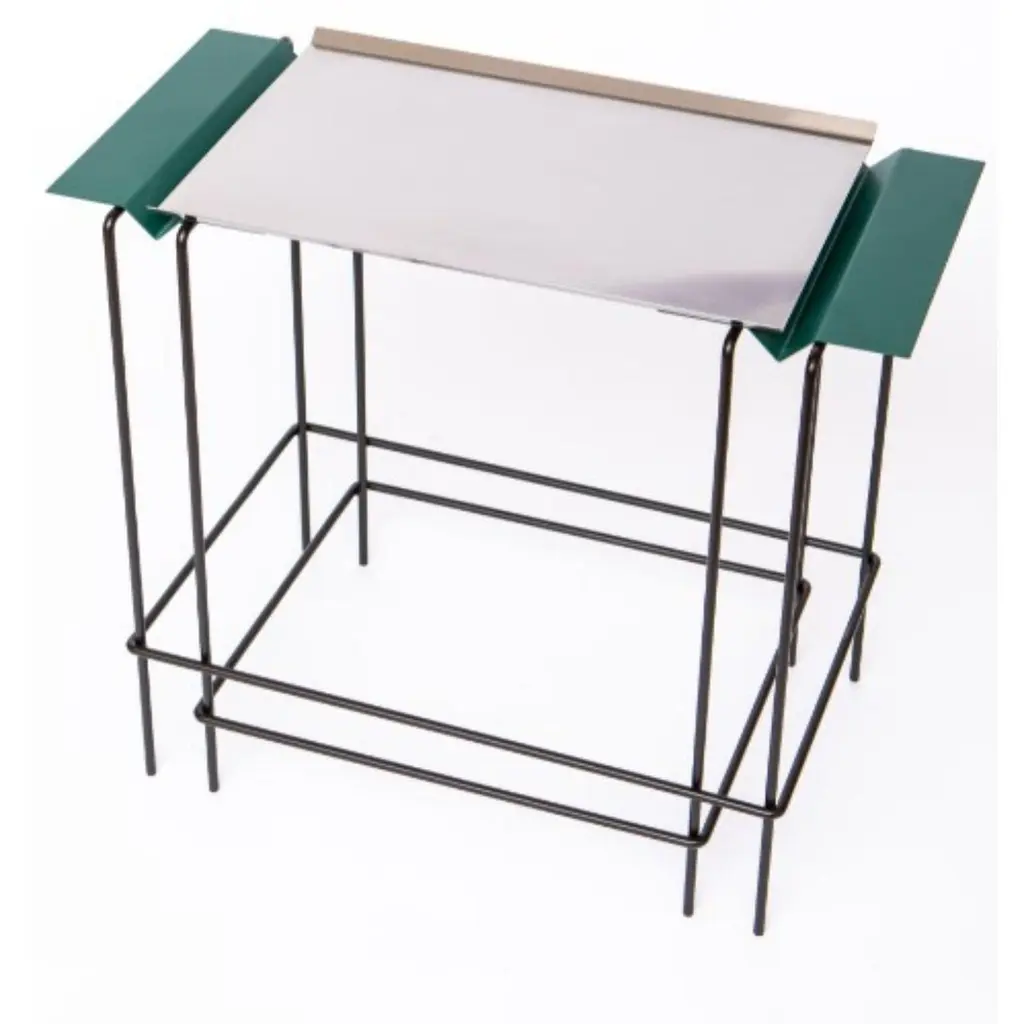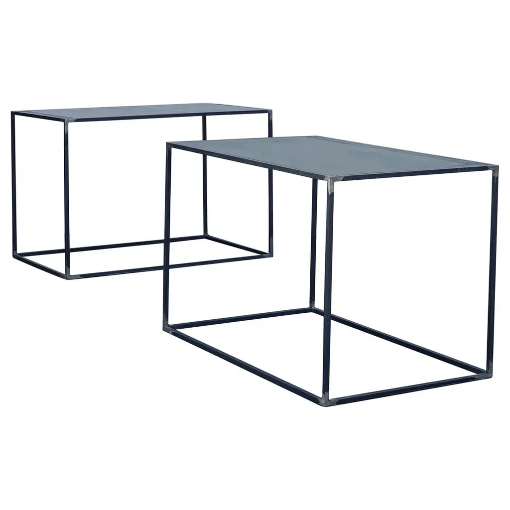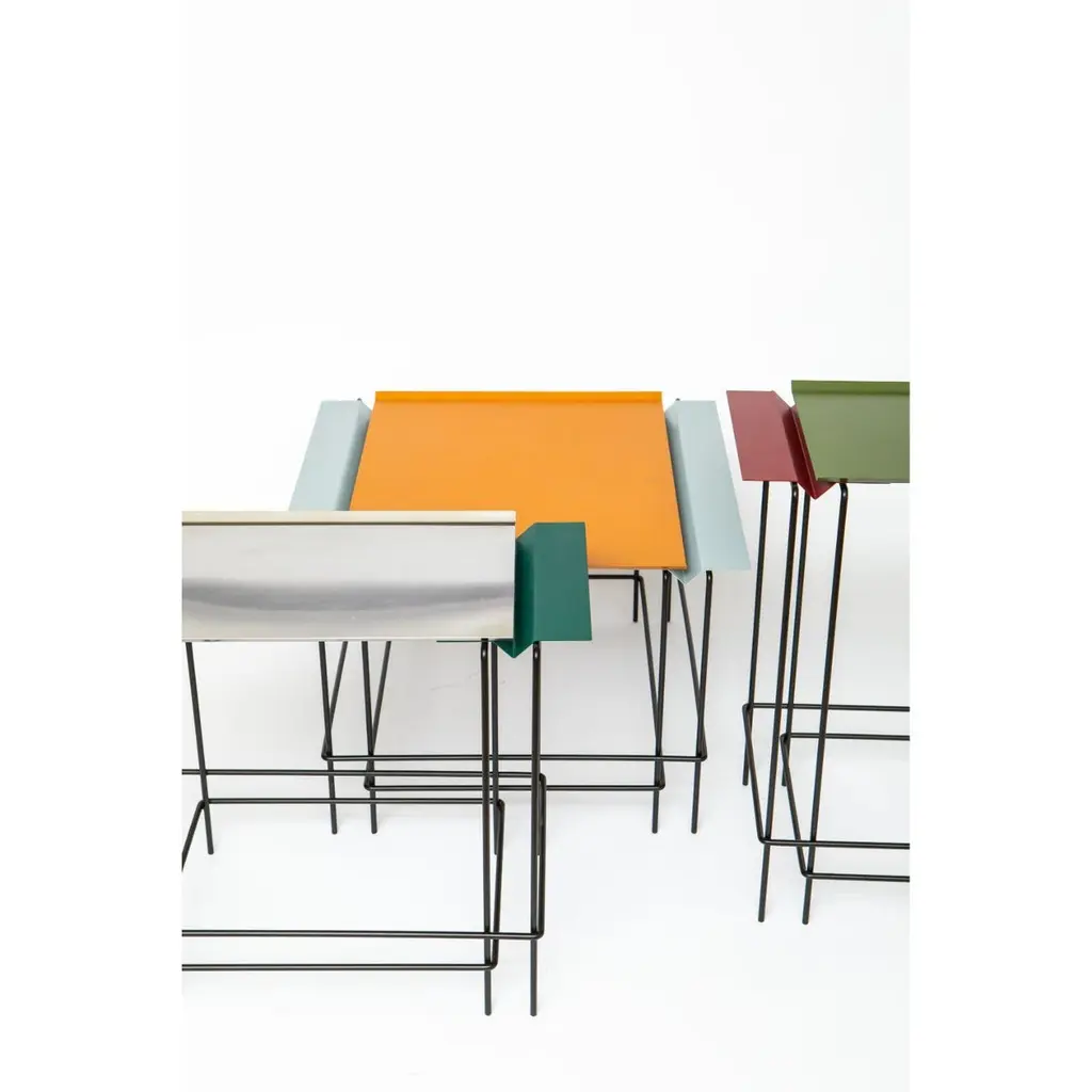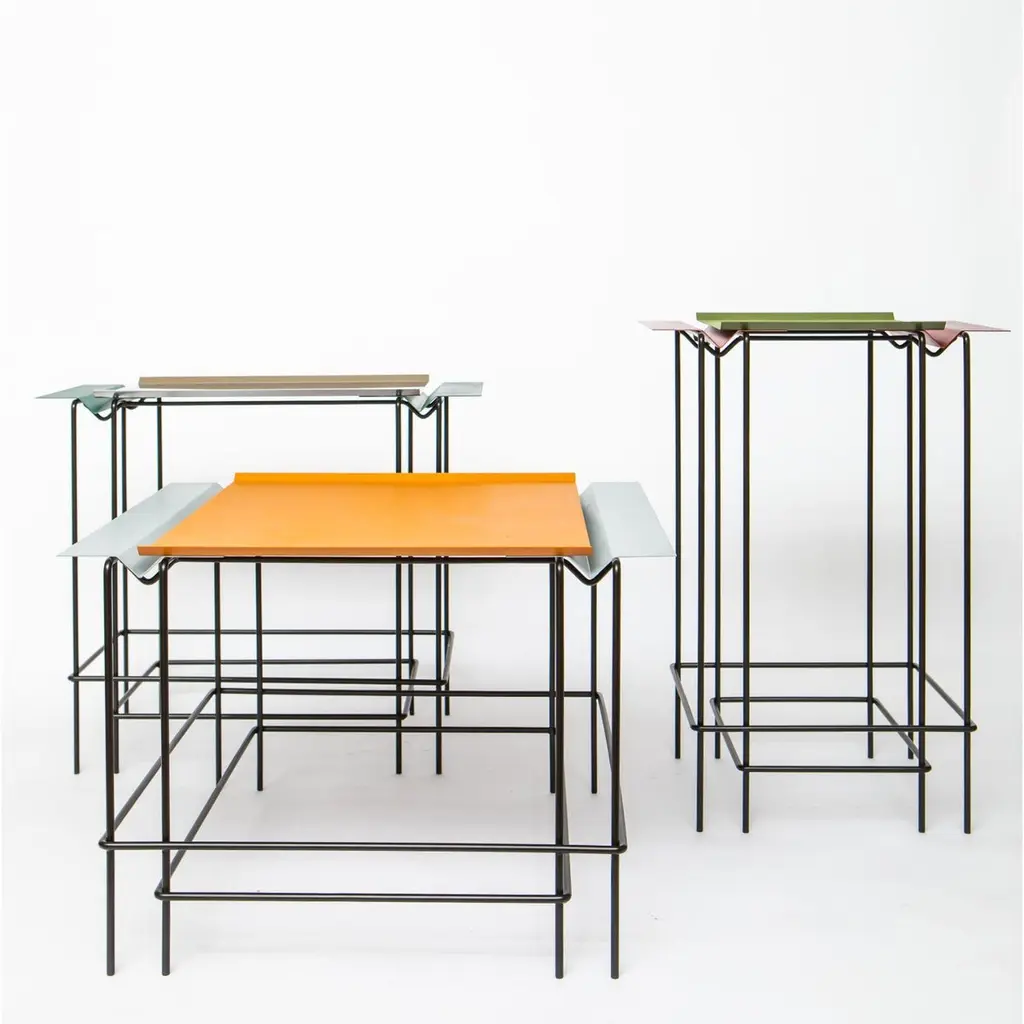 A Set of 3 Leva - tables by Alva DesignMaterials: Painted Metal, Stainless SteelDimensions: 643 x 60 x 32, 60 x 50 x 32, 60 x 40 x 59 cmALVA is a furniture and objects design office, formed by brothers Susana Bastos, artist and designer, and Marcelo Alvarenga, architect. Their projects are the result of the meeting of these two visions, the architectural and the artistic, and beyond the usual rationality and functionality, they seek the unusual, new uses and an expressive materiality. The duo's creation process starts from a sensitive observation of people's daily lives, their habits and current needs, together with a perception of new potentialities to be artistically explored. In the development of each piece, the technical and aesthetic baggage of the brothers, acquired through important experiences in the architecture and fashion market, is added to a strong relationship with their Minas Gerais and Brazilian origins. In the execution phase, the selection of raw materials and the exquisite manufacturing, often handcrafted, give a unique aspect to the works. The result is contemporary pieces loaded with memory.Alva's first line of furniture and objects was launched in 2013 at the MADE (Mercado, Arte, Design) fair in São Paulo. Following this launch, the firm partnered with Etel - a brand now known worldwide for publishing the best of Brazilian design - to produce and market some of its creations, bringing the brothers' names into the special group of authorial designers represented by it. Since their first release, Susana and Marcelo's creations have gained visibility in several important publications, websites and magazines, both national and international.