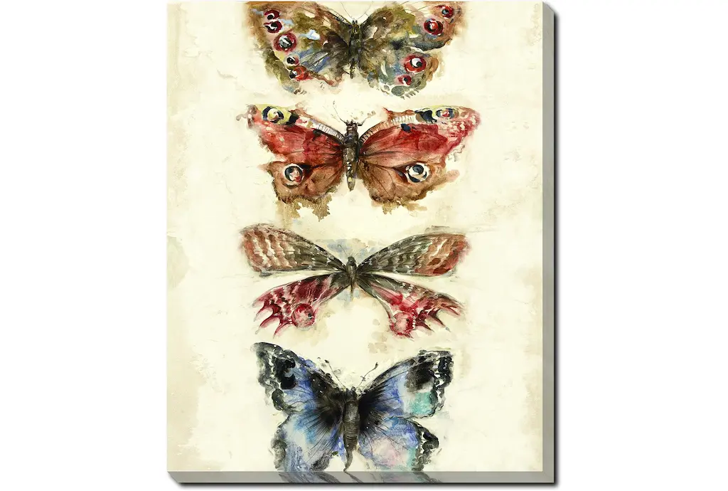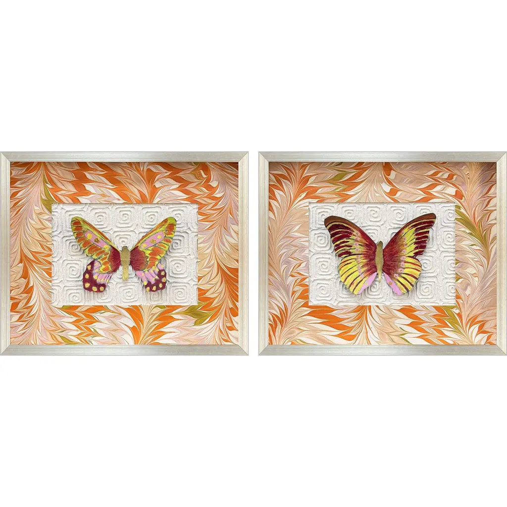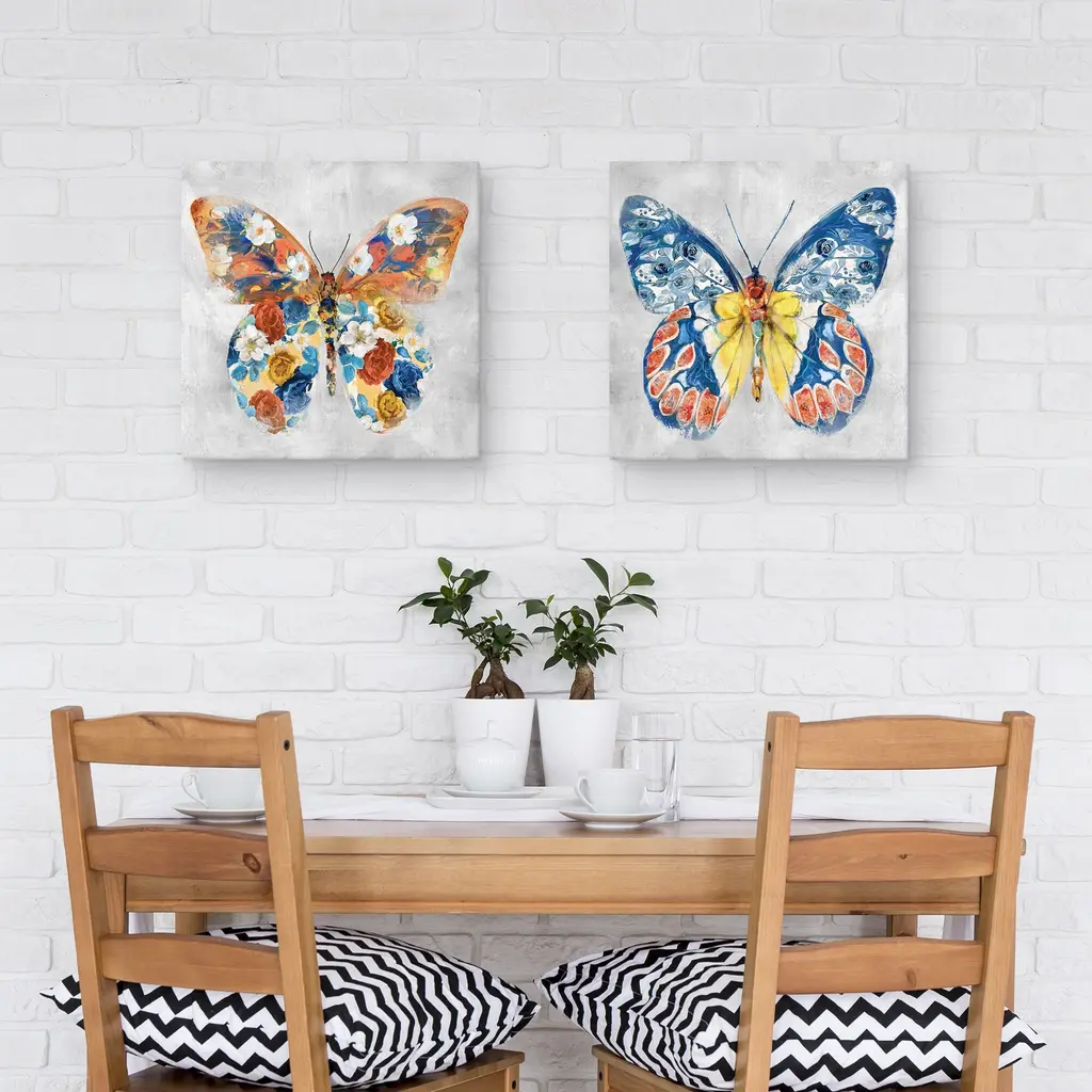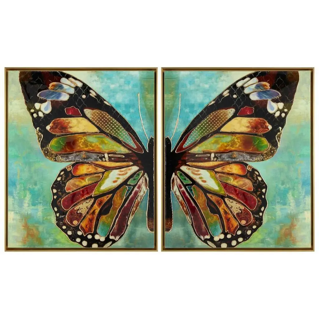 Wings of Wisdom is a breathtaking piece split across two panels. A majestic butterfly with a gilded outline showcases a stained glass look against a matte gel background with a porous texture. Both panels are displayed within a gold floater frame.