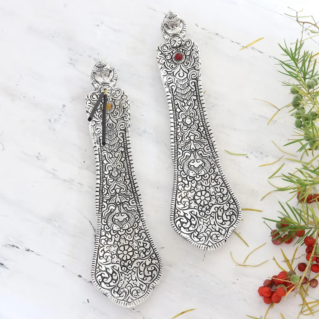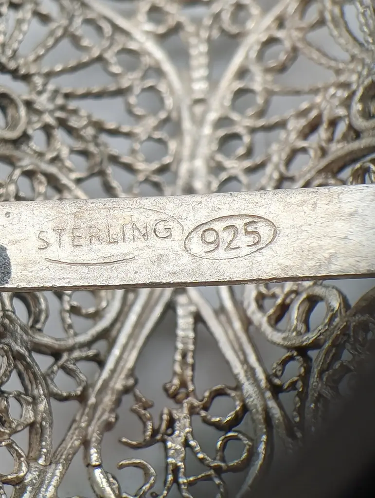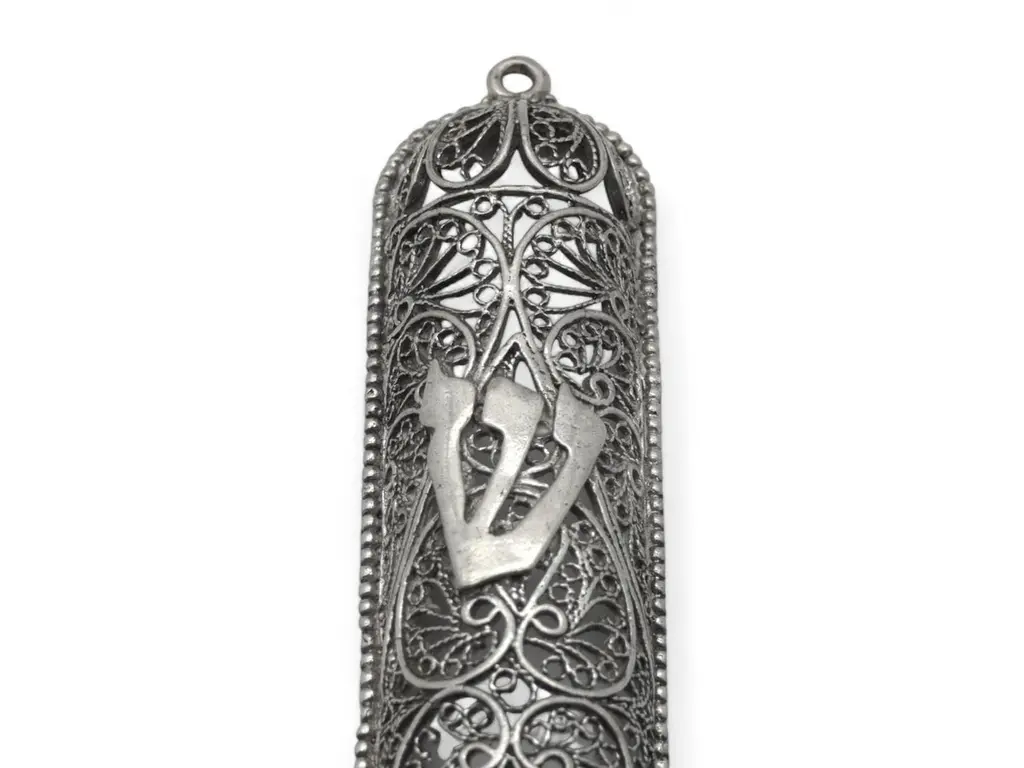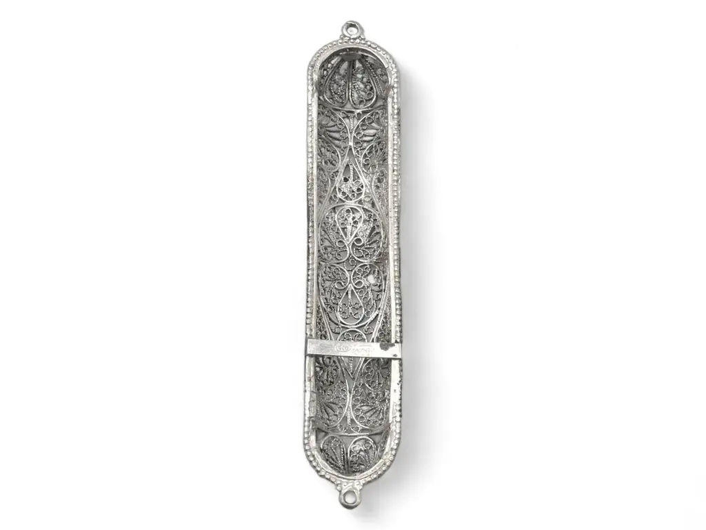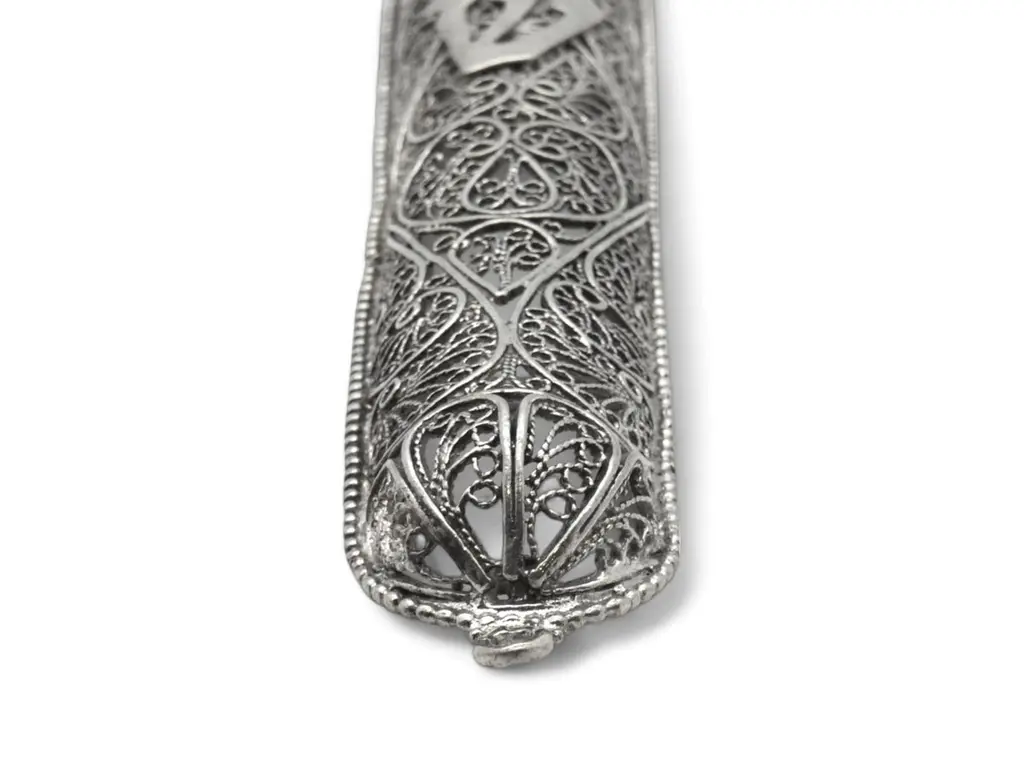 A Silver Filigree Mezuzah Case from Israel circa 1980, exemplifies the intricate craftsmanship of Judaica art.In Israel during the 1980s, there was a resurgence of interest in traditional Jewish craftsmanship combined with modern design sensibilities. Filigree work, known for its lacy patterns and meticulous detail, was particularly valued for its ability to adorn religious objects such as Mezuzah cases.Oval-shaped with two rings applied above and below, this Mezuzah case is entirely made out of filigree with foliate lacy patterns and heart-shaped detail. a prominent letter shin is applied to the front of the case as is normally found on Mezuzah casesThis Filigree Mezuzah case serves not only a practical function of housing the sacred parchment scroll but also symbolizes a connection to Jewish heritage and spirituality. It reflects the creative evolution of Judaica art in Israel, blending traditional techniques with contemporary artistic expressions.
