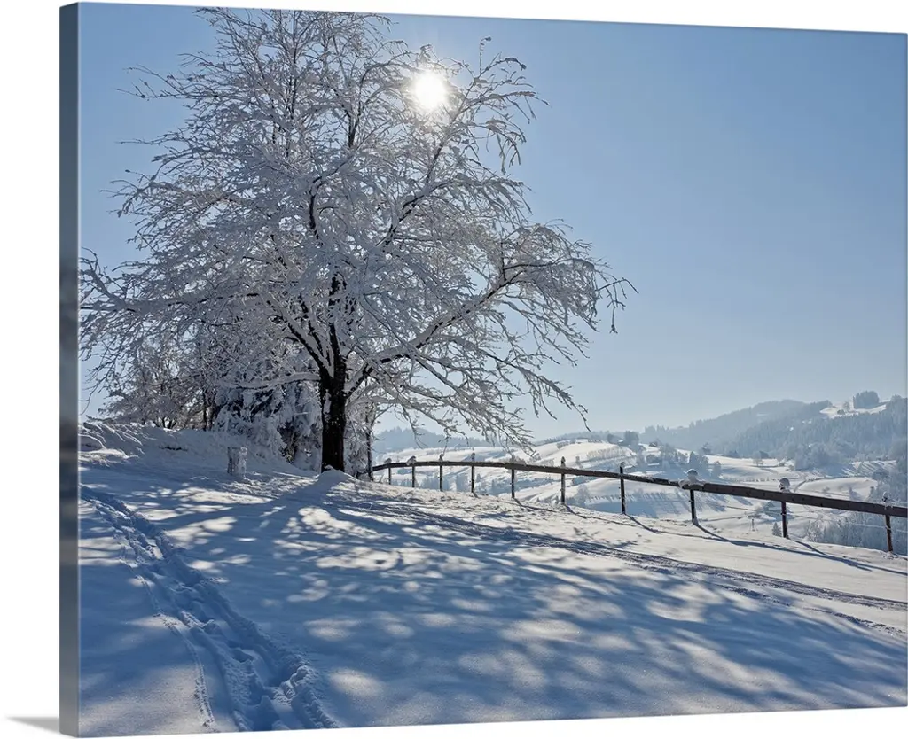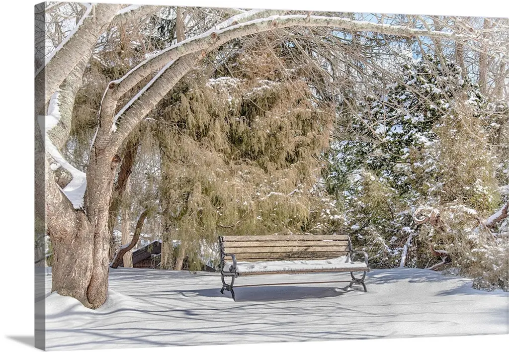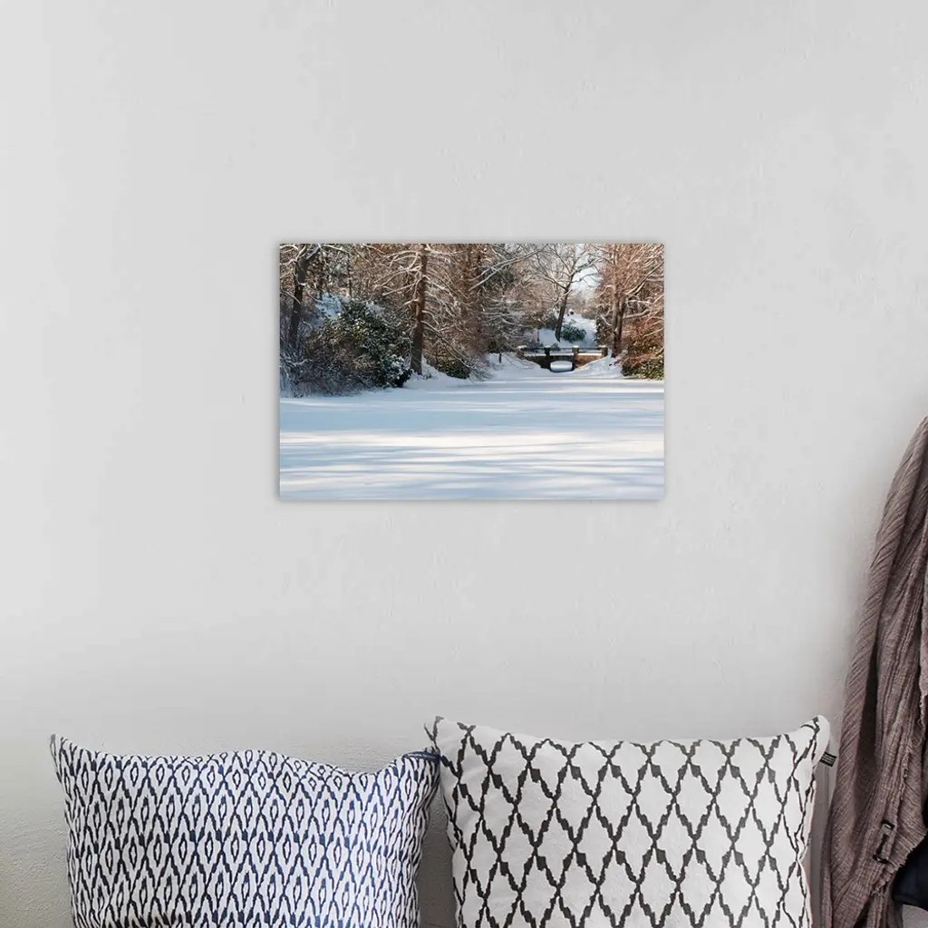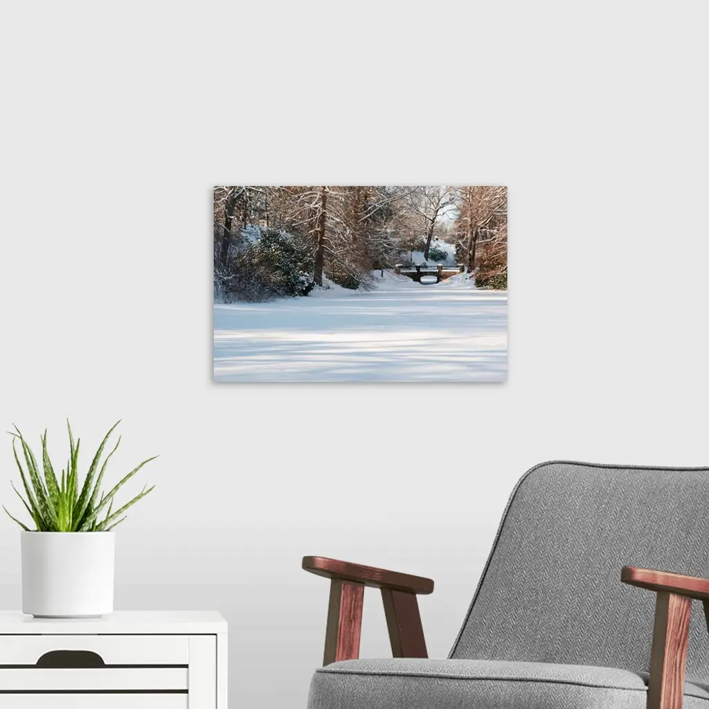 A Snow-Covered Landscape With A Pond, Trees, And A Footbridge.; Cambridge, Massachusetts.