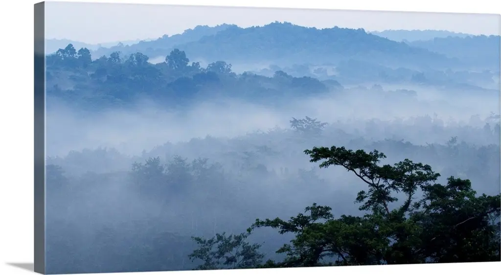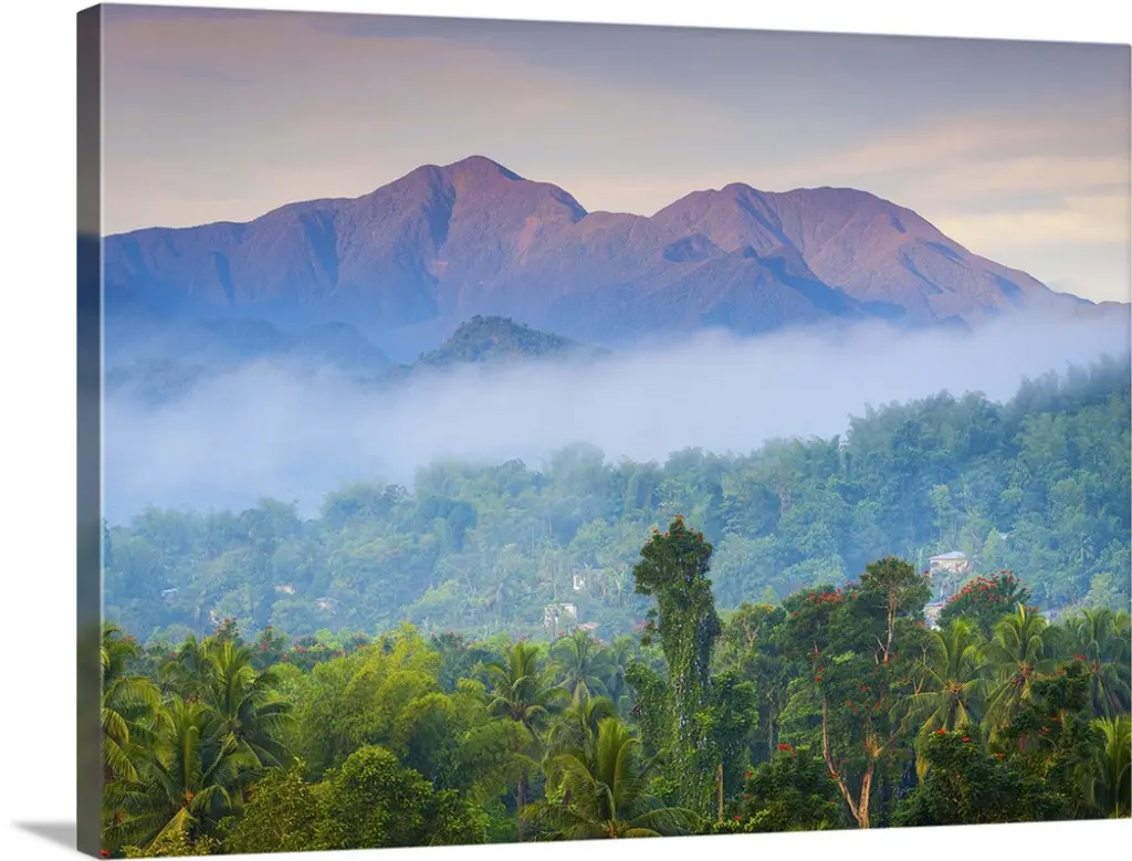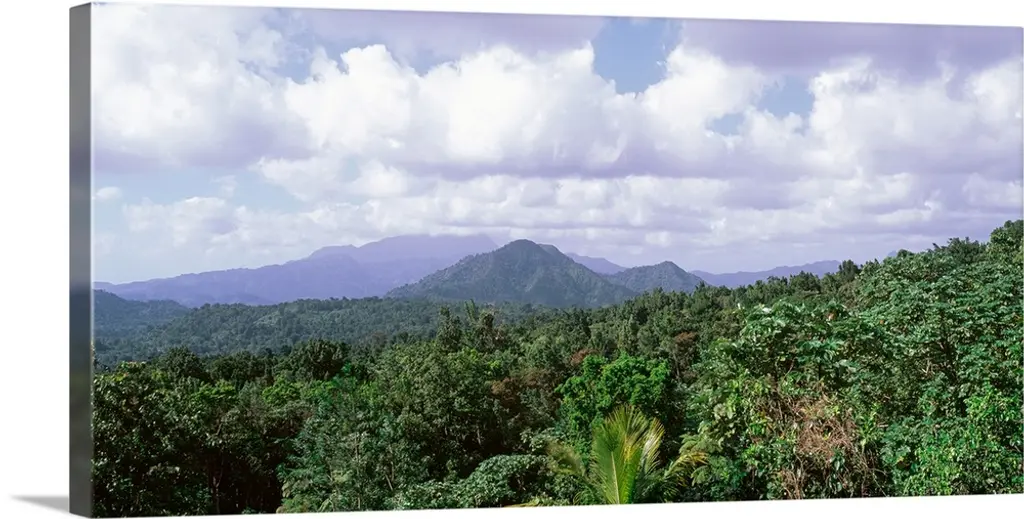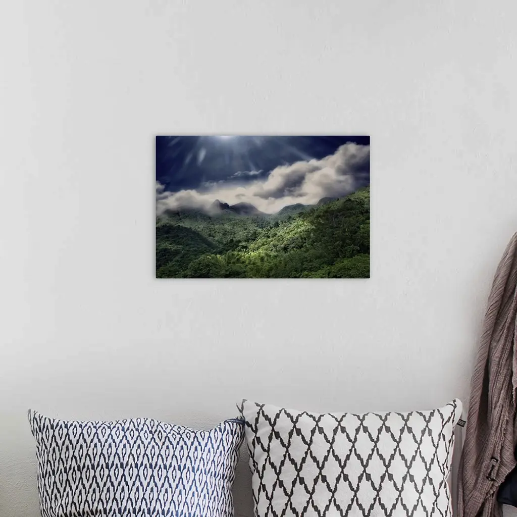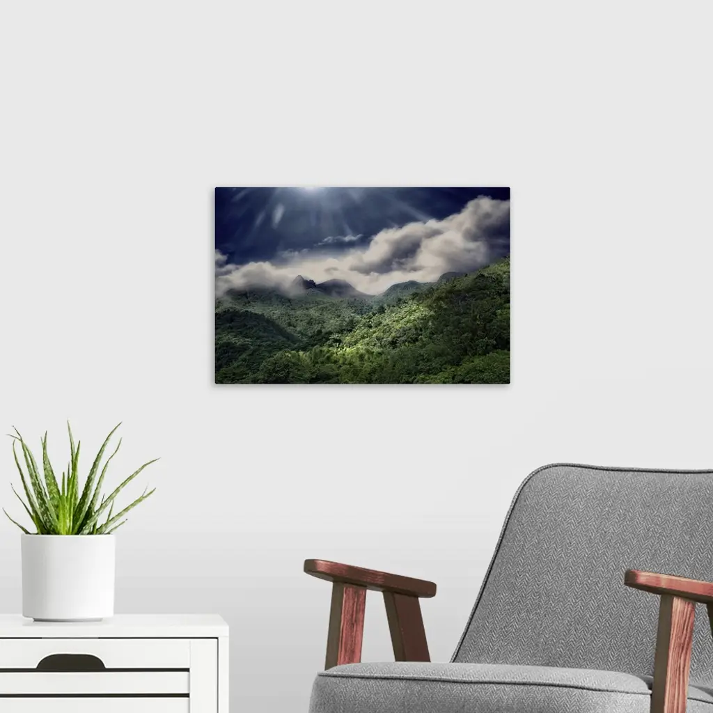 A sunny day in El Yunque National Park in Puerto Rico with clouds and fog on the rain forest
