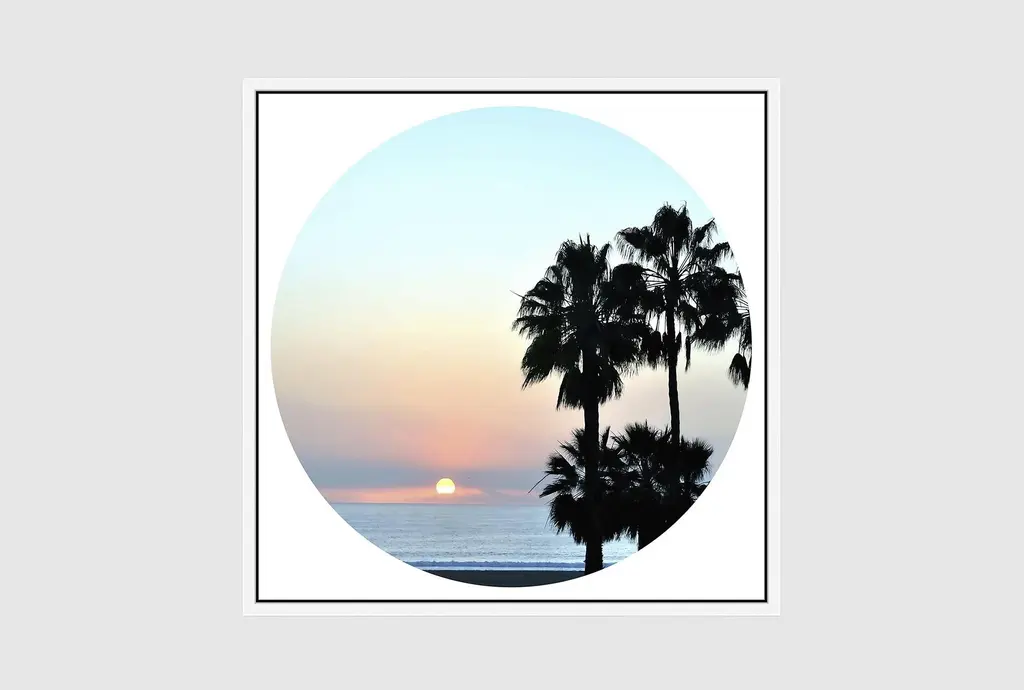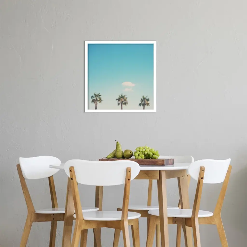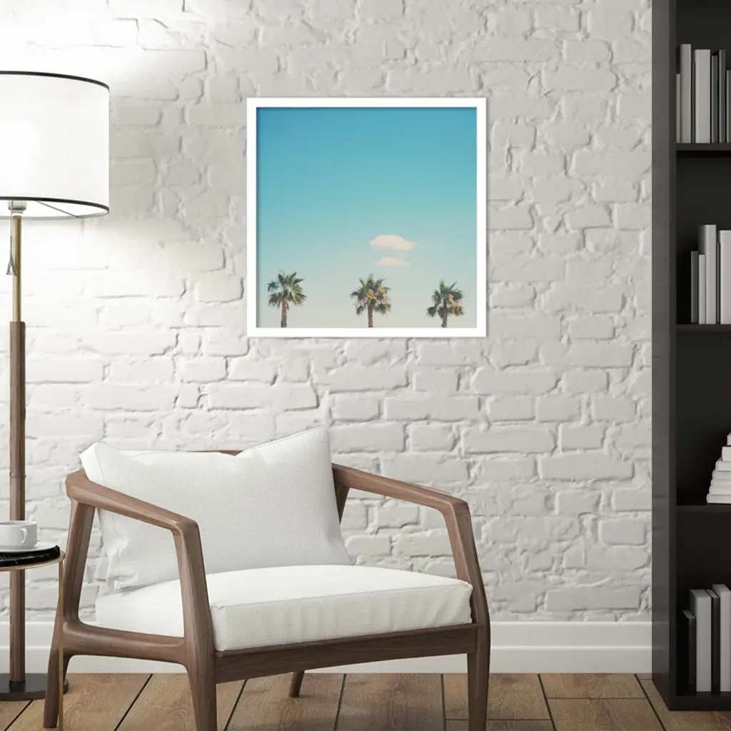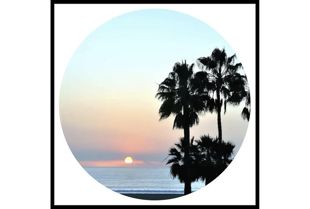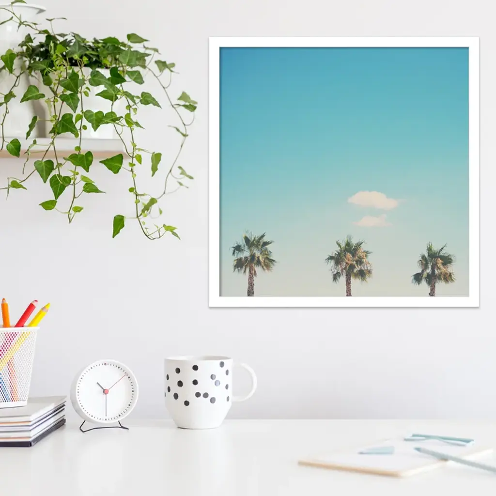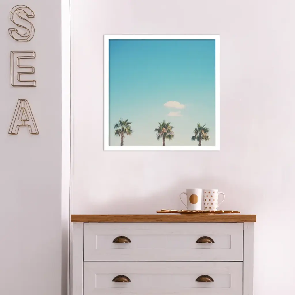 Soak up some sunny West Coast vibes with this photo print that leans into its warm saturated colors. Printed in the USA, this piece by photographer Laura Evans features a shot of palm trees clustered along the bottom of the frame, with a warm expanse of blue skies above them. This piece is giclee-printed on paper with an accurate reproduction. It arrives framed and covered with acrylic glass that helps protect the image from fading. Wall mounting hardware is included, so it's ready to hang right out of the box.