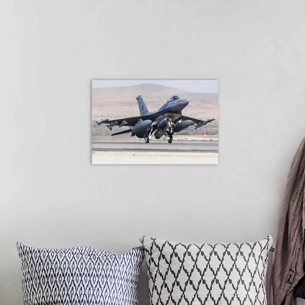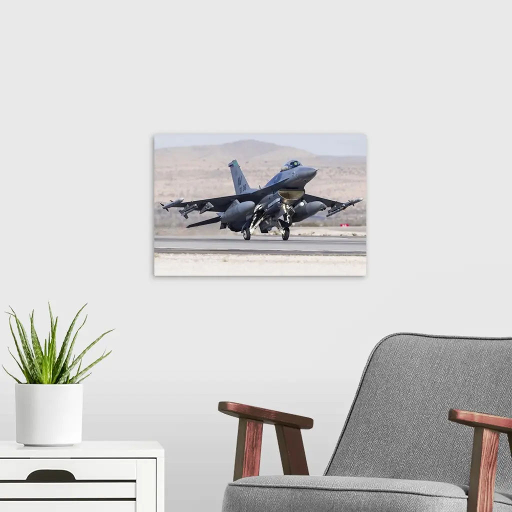 A U.S. Air Force F-16C Fighting Falcon landing at Nellis Air Force Base, Nevada.