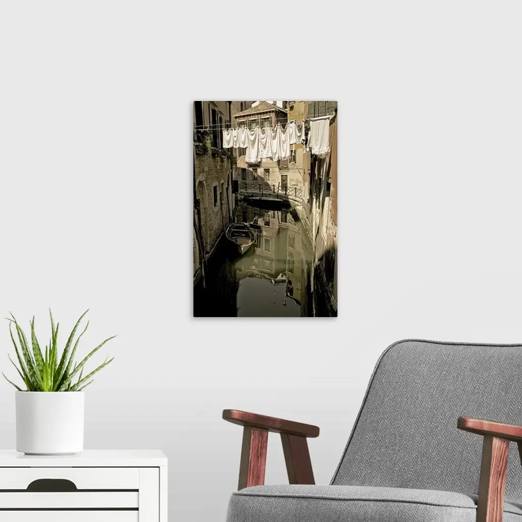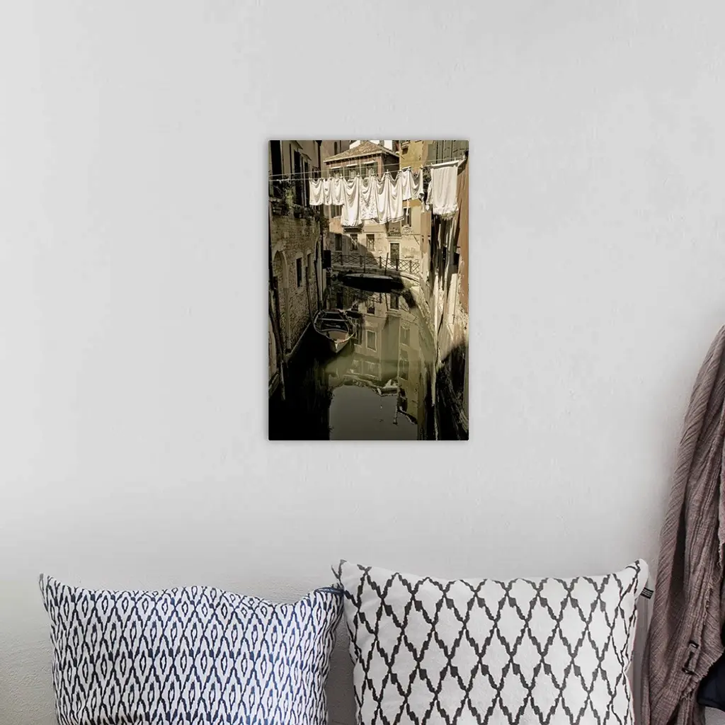 Laundry drying on a clothesline, hanging over a canal in Venice, Italy.
