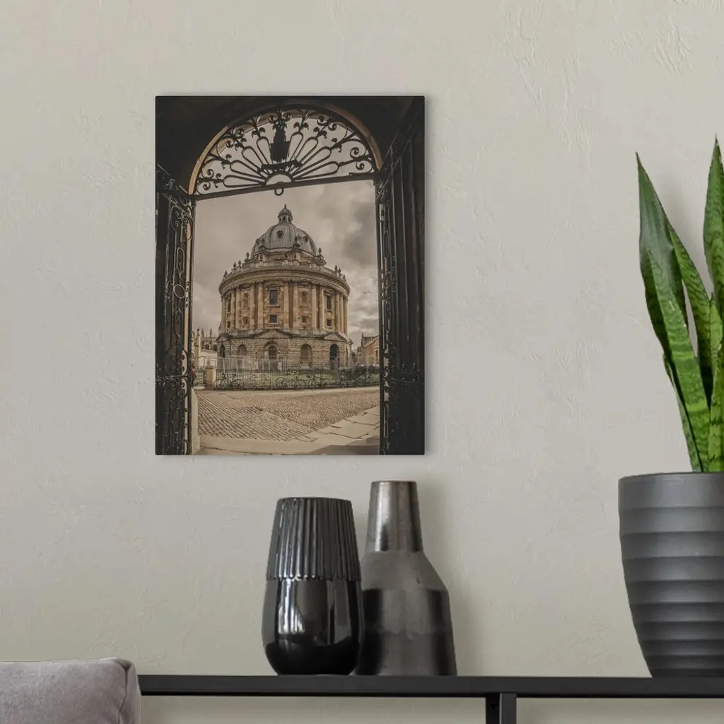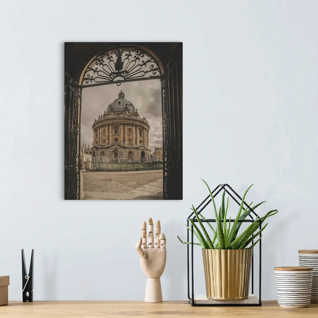 A vertical image of the Radcliffe Camera and Radcliffe Square framed by a metal gate in Oxford