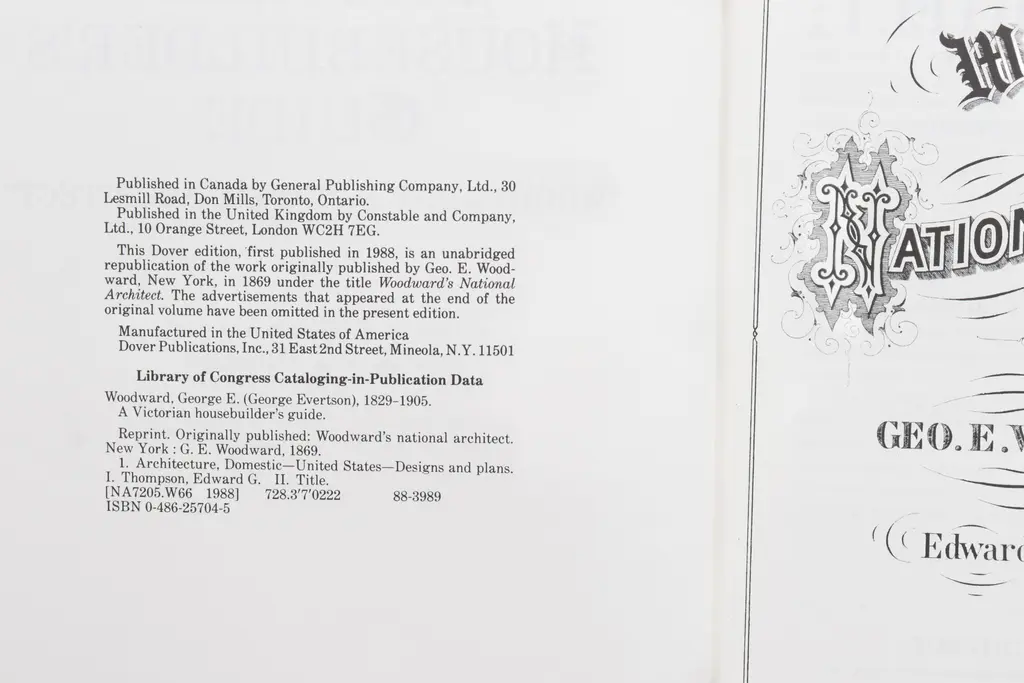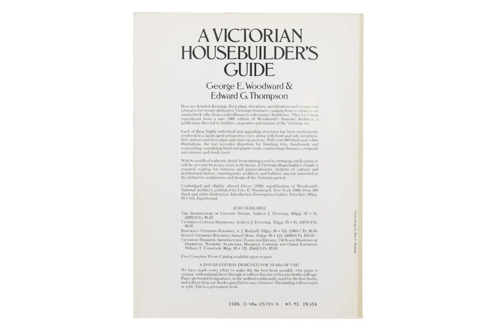 A Victorian Housebuilder's Guide by George E. Woodward and Edward G. Thompson. Softcover book published in 1988 by Dover Publications Inc., of New York. Manufactured in the USA, Illustrated.