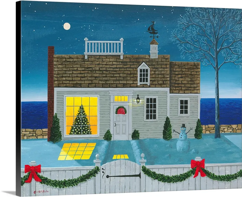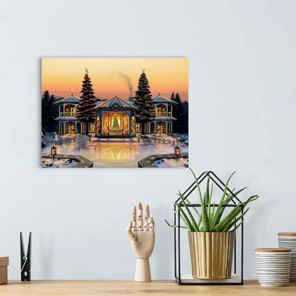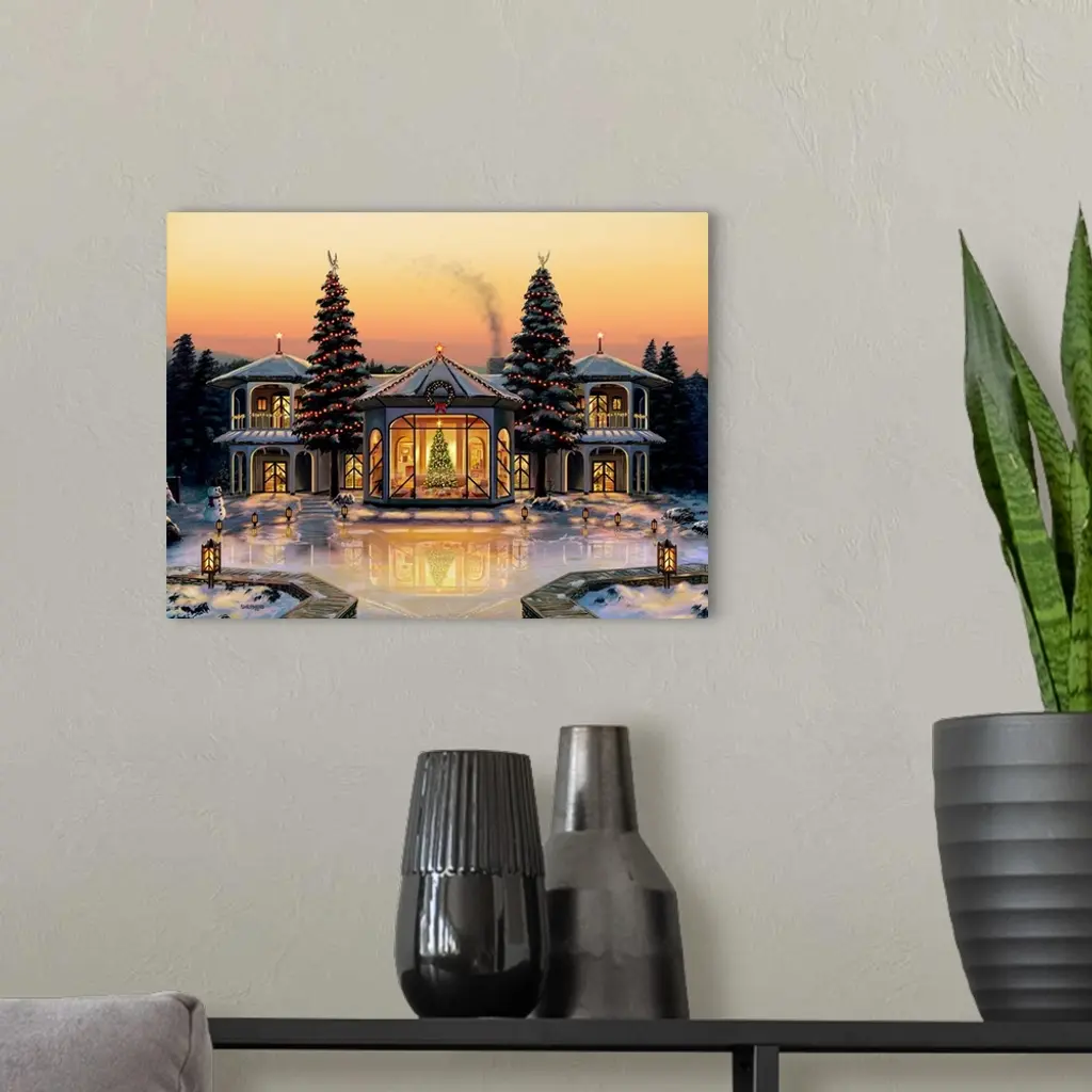 Under an orange and gold winter sunset a lavish dream home waits decorated for the season.