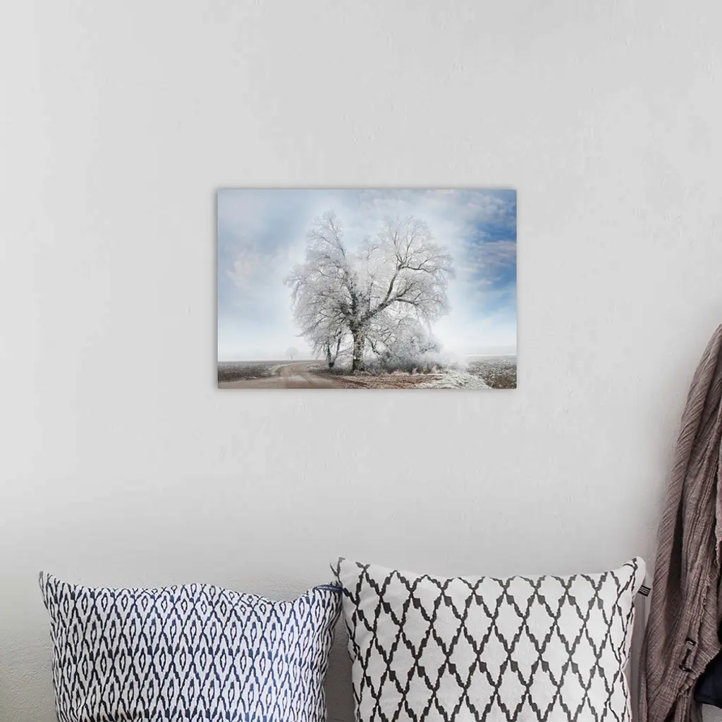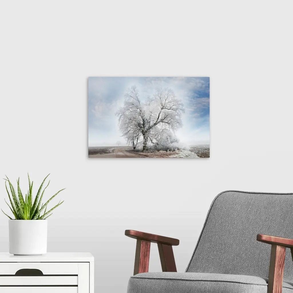 Photograph of a dirt road winding next to a large snow covered tree in the middle of no where.