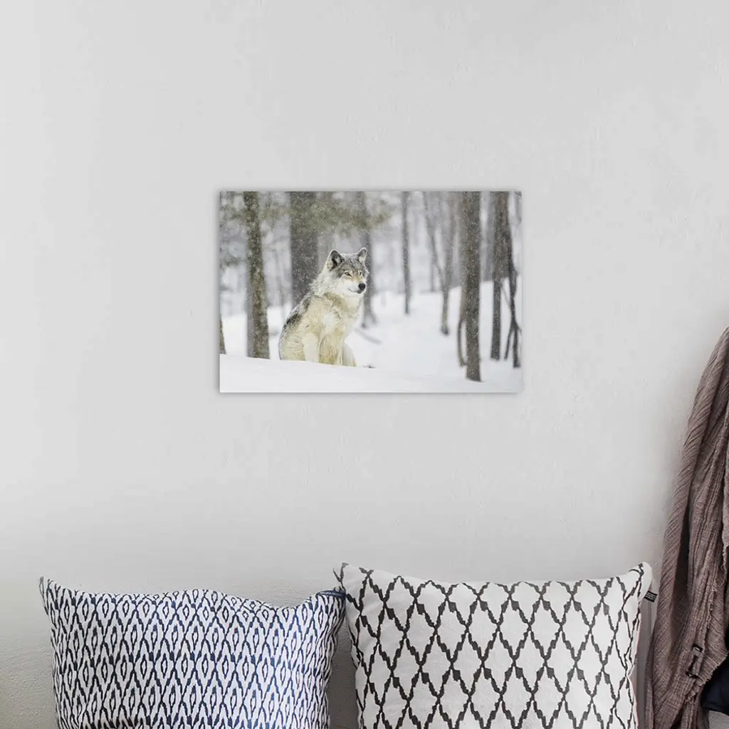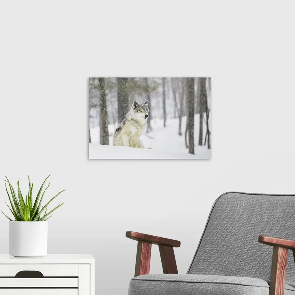 A Wolf Sitting In A Snowfall In A Forest wall art for home and office decor. Discover canvas art prints, photos, mural, big canvas art and framed wall art in GreatBigCanvas.com's varied collections.
