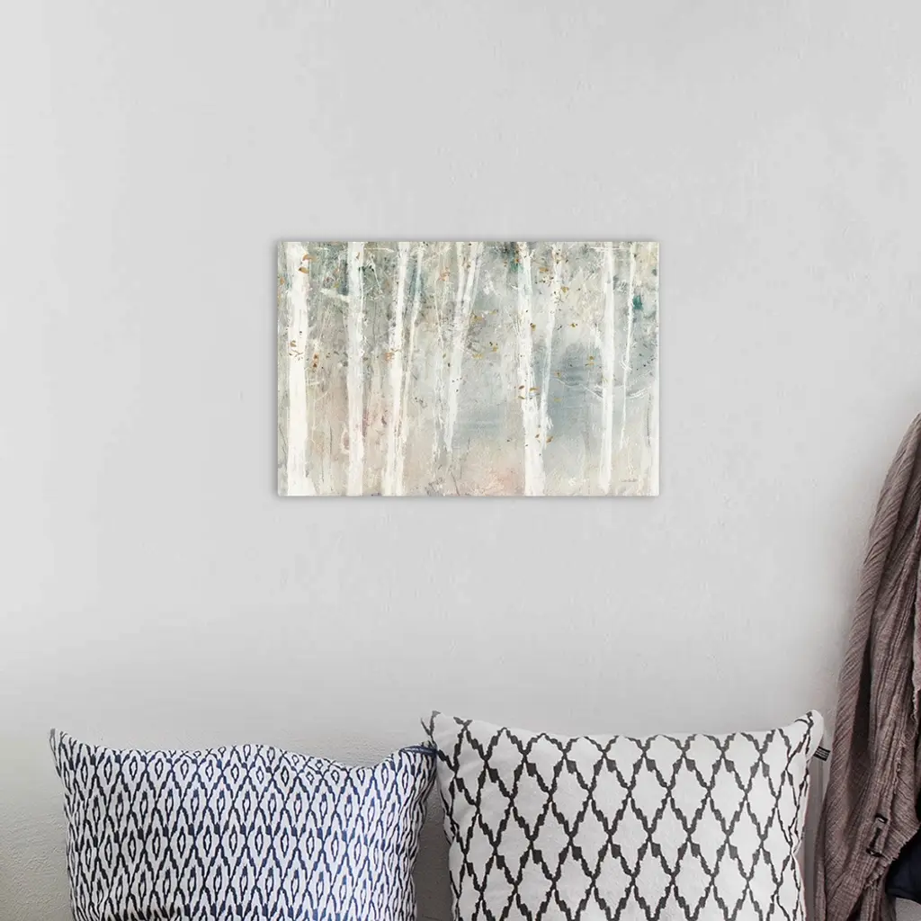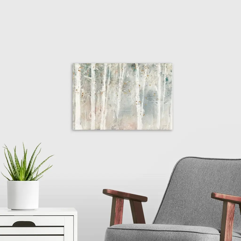 A contemporary abstract landscape of white trees in the forest with a water-colored neutral background and golden leaves.