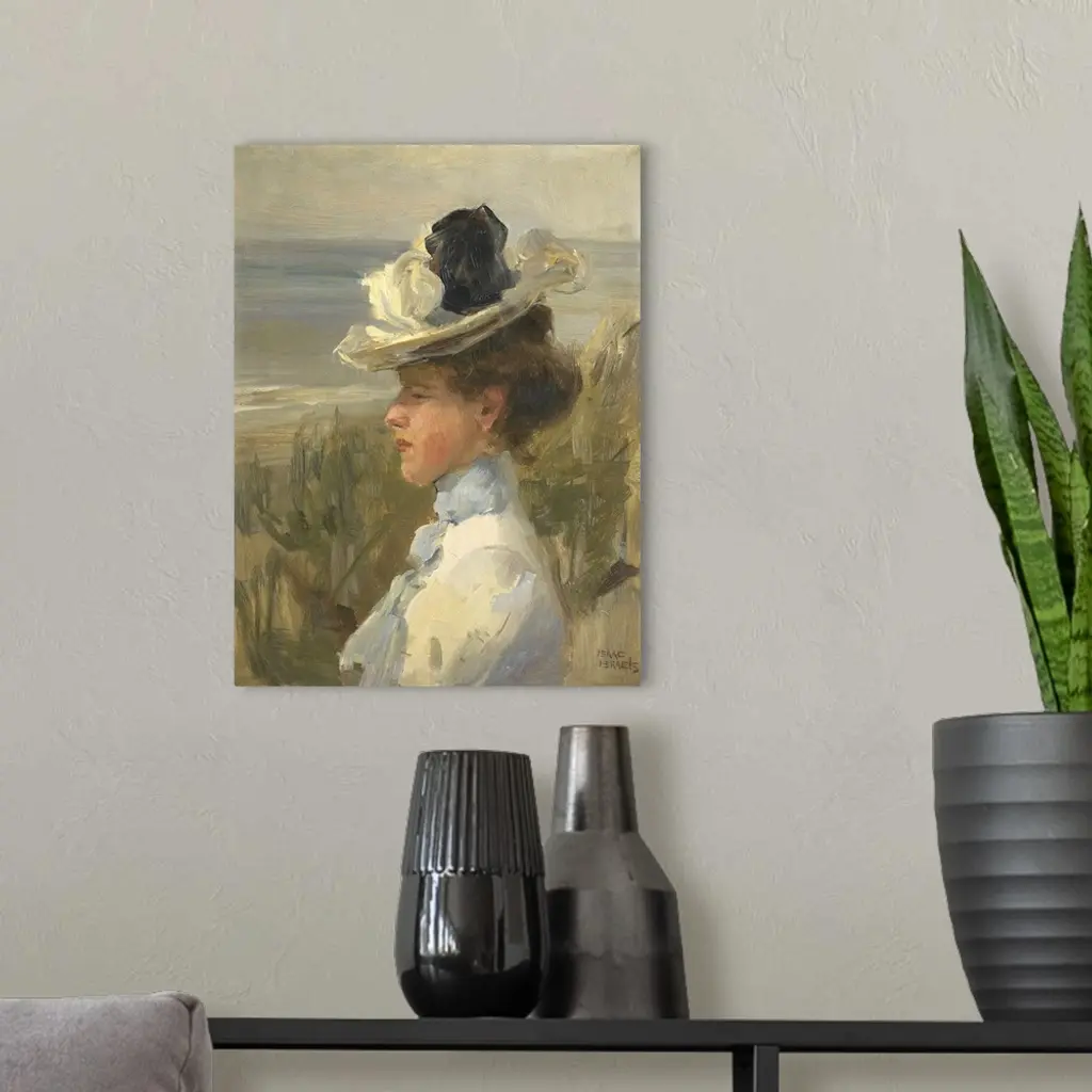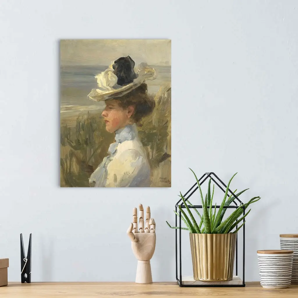 1895. An Edwardian woman looks out to sea standing alone with thoughtful expression.