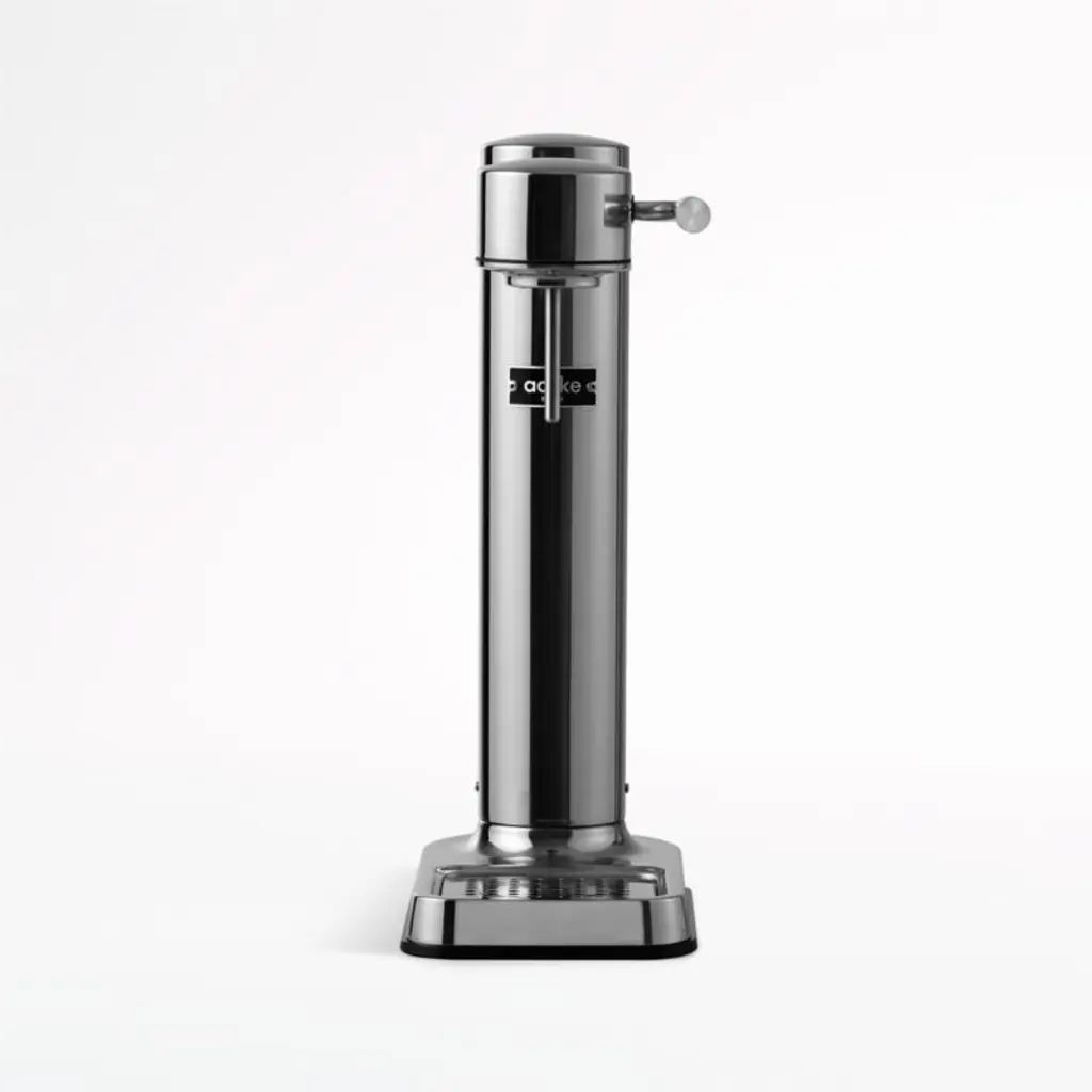 Sparkle your own water with this streamlined water carbonator constructed of polished stainless steel. A striking yet understated presence on your kitchen countertop, the compact sparkling water maker fits in anywhere, while the slender proportions and stainless steel accents are elegant and modern. Ultra-simple operationtwist bottle on, press lever, release lever and twist bottle offmakes carbonating water a breeze. The precision nozzle releases CO2 in a calm, controlled spray for efficient absorption and optimal bubble size. With its classic curves and polished stainless steel lid and base, the included one-liter bottle looks sleek on the table or in the fridge.We now offer an in-store carbonator cylinder exchange program. Bring your empty CO2 cylinder to Crate & Barrel and exchange it for a replacement at a 50% discount. Empty cylinders are returned to the manufacturer for reuse.