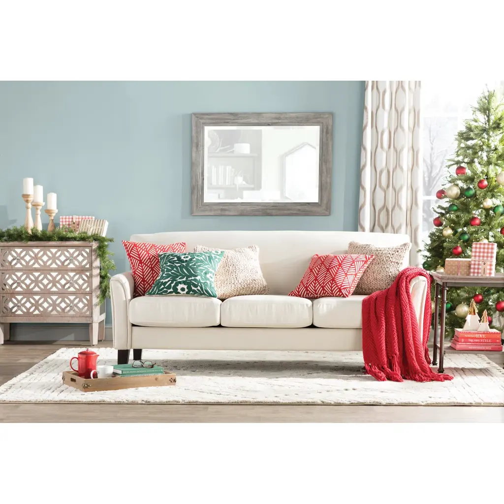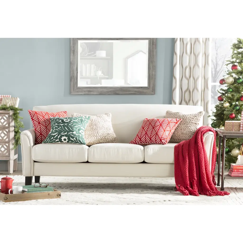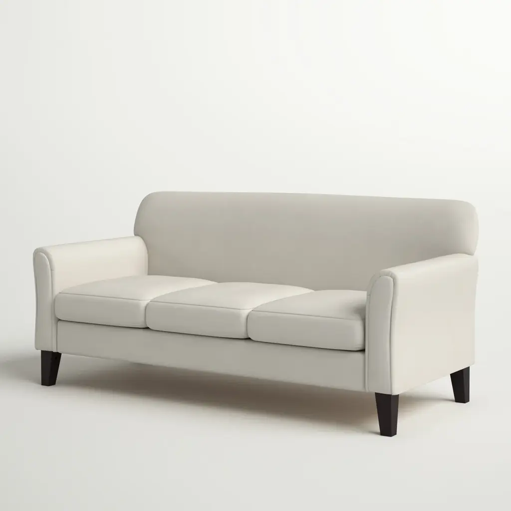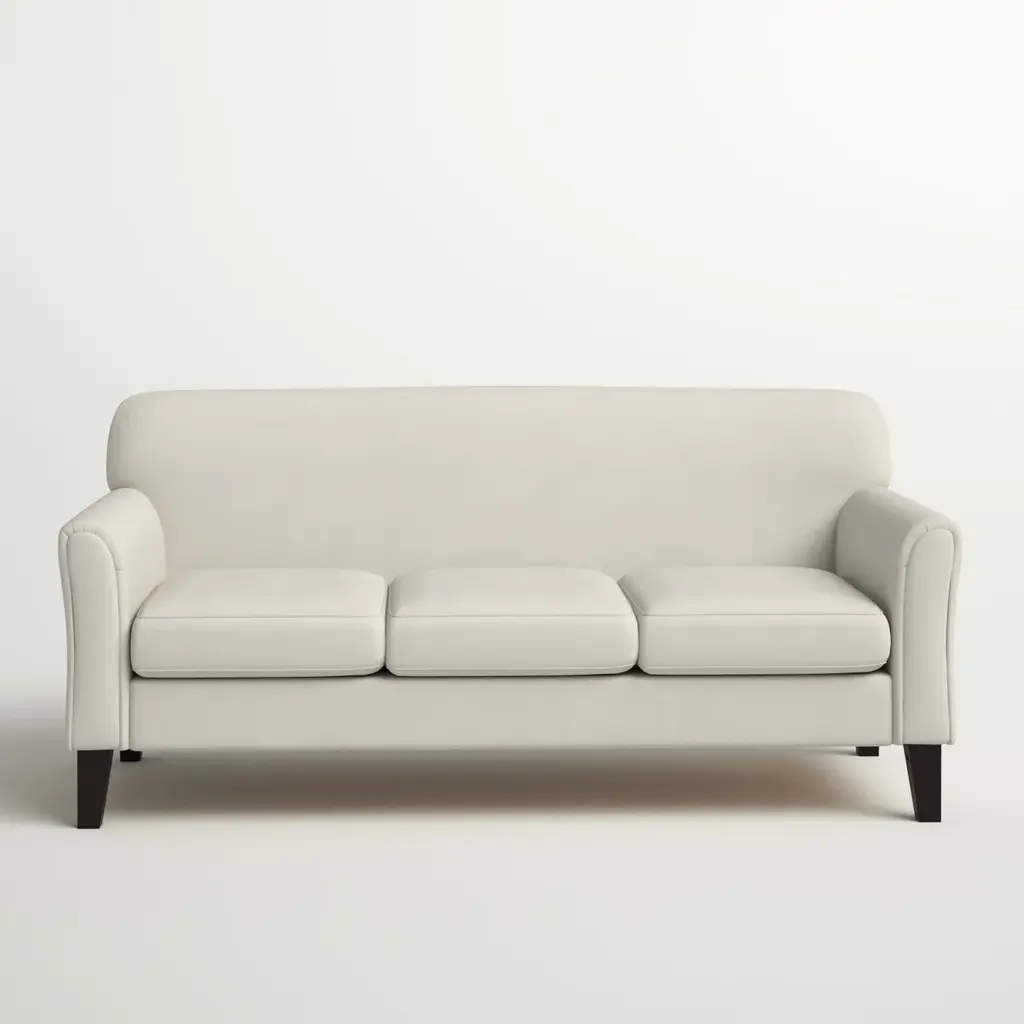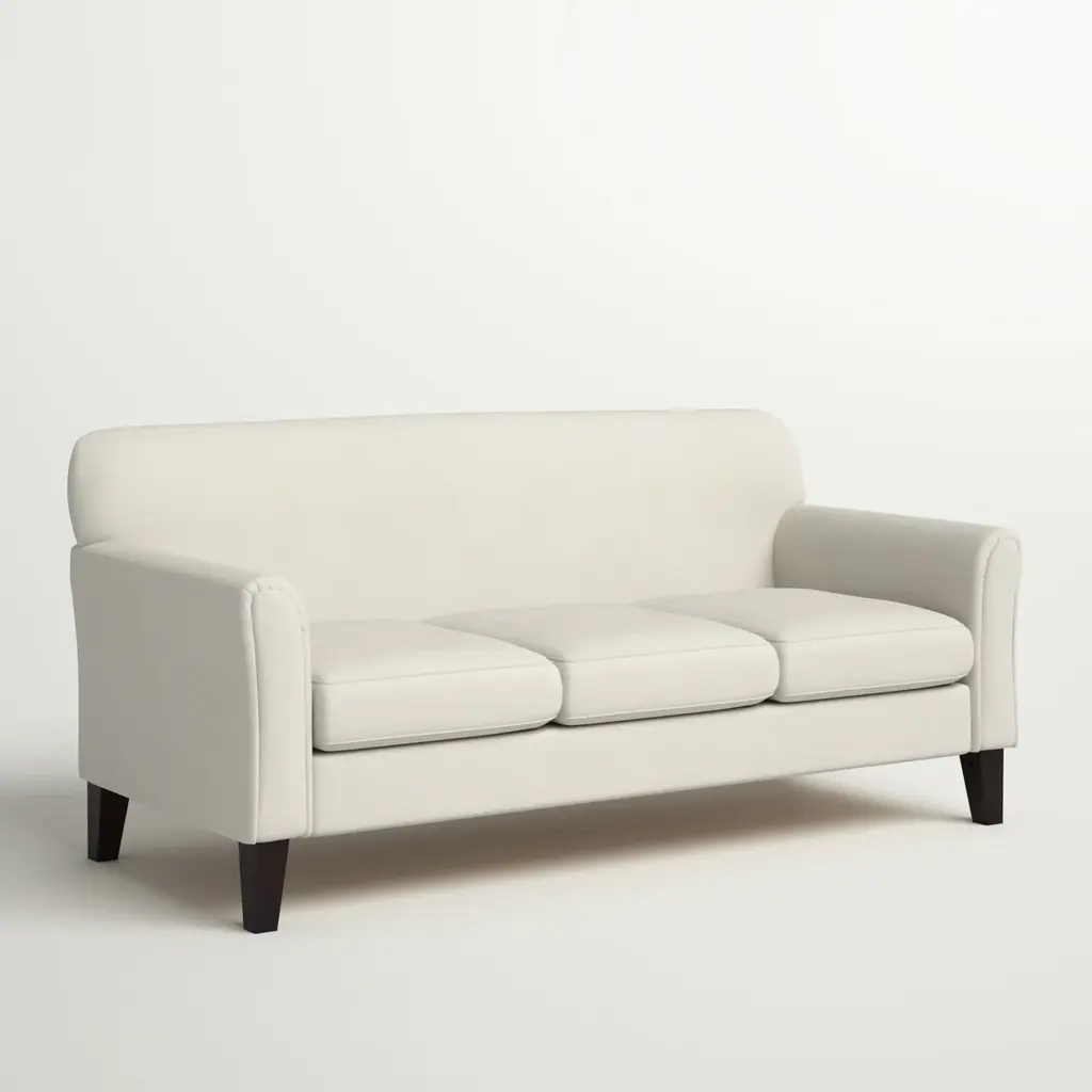 About This Product This sofa grounds your living room in a classic yet modern style. It's crafted with a solid wood frame that rests on solid wood tapered legs with an espresso hue. This couch is wrapped in polyester blend in a soft neutral tone. The foam-filled cushions support you as you relax. We love how the flared arms and cushion back lend this sofa a traditional silhouette. To care for it, spot clean with a damp cloth. Not Included: Toss Pillow(s) Features Includes one (1) sofa Flared arms Loose, removable seat cushions Solid cushioned back Wood grain finish on feet