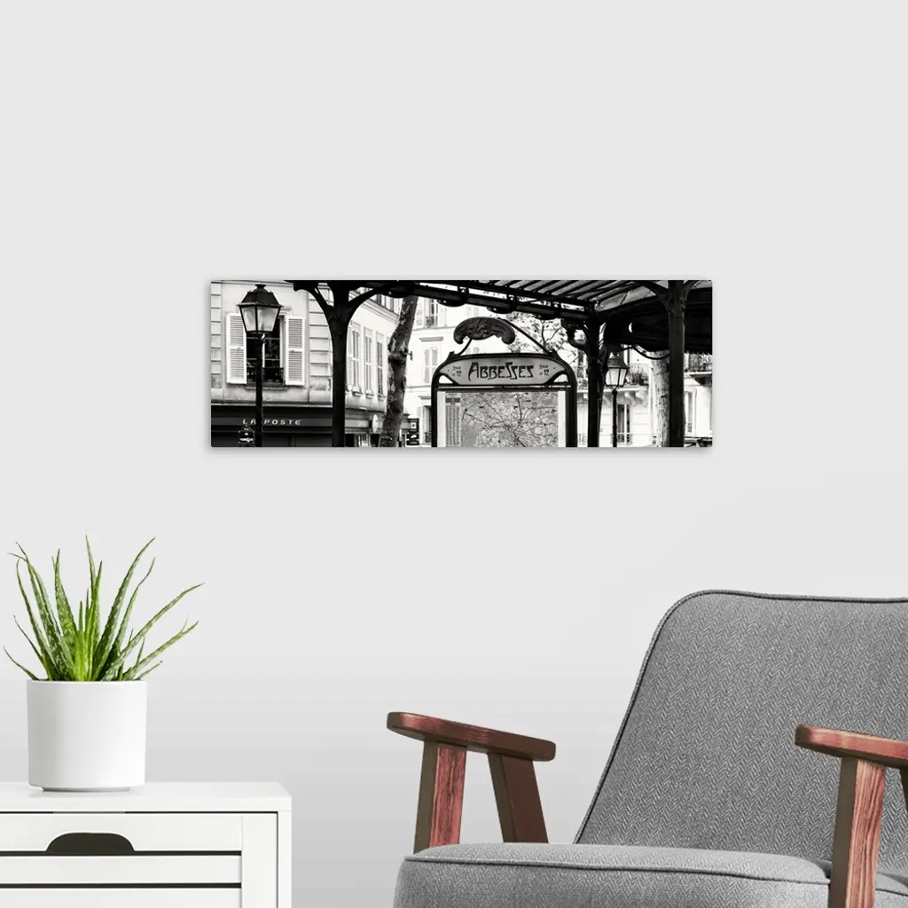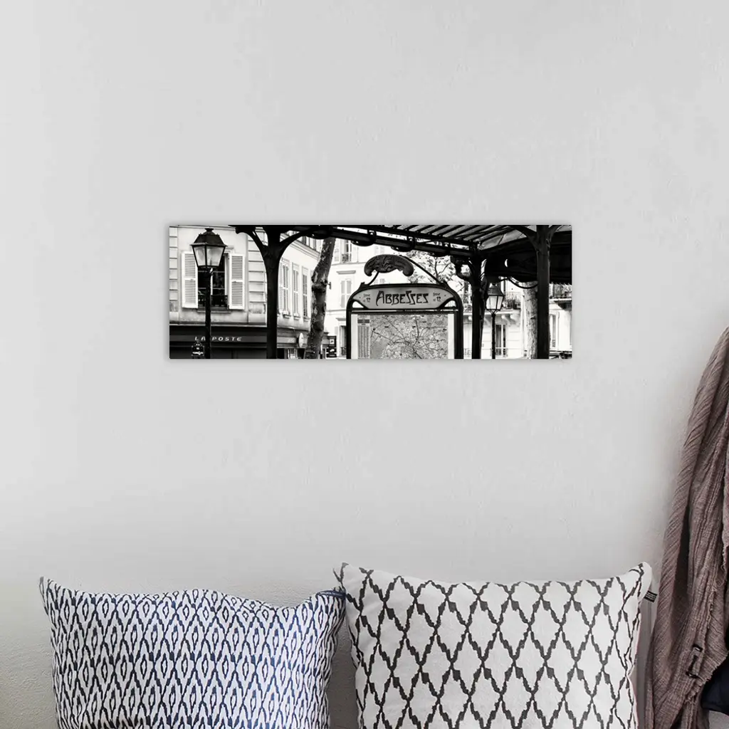 A black and white photograph of the Abbesses subway station sign in Paris.